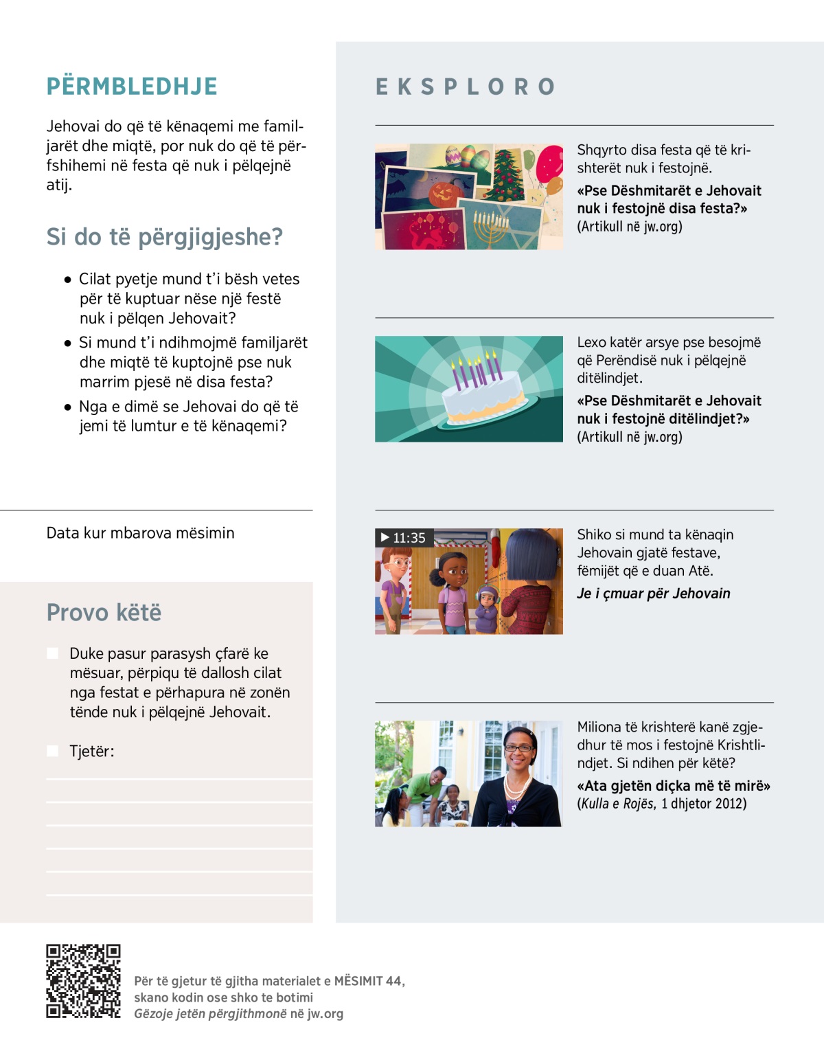 «Pse Dëshmitarët e Jehovait nuk i festojnë disa festa?» (Artikull në jw.org)