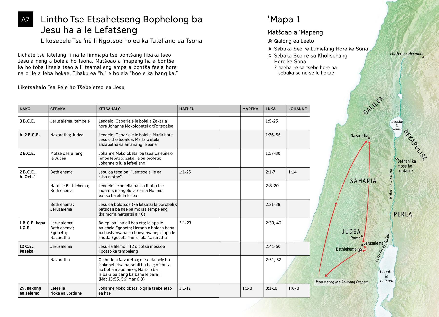 Lichate tse latelang li na le limmapa tse bontšang libaka tseo Jesu a neng a bolela ho tsona. Matšoao a ’mapeng ha a bontše ka ho toba litsela tseo a li tsamaileng empa a bontša feela hore na o ile a leba hokae. Tlhaku ea “h.” e bolela “hoo e ka bang ka.”