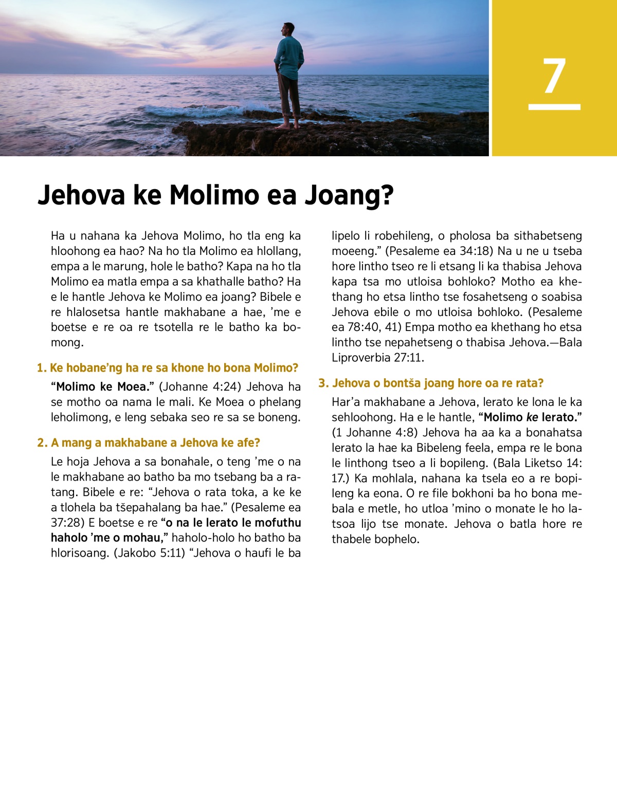 Ha u nahana ka Jehova Molimo, ho tla eng ka hloohong ea hao? Na ho tla Molimo ea hlollang, empa a le marung, hole le batho? Kapa na ho tla Molimo ea matla empa a sa khathalle batho? Ha e le hantle Jehova ke Molimo ea joang? Bibele e re hlalosetsa hantle makhabane a hae, ’me e boetse e re oa re tsotella re le batho ka bomong.
