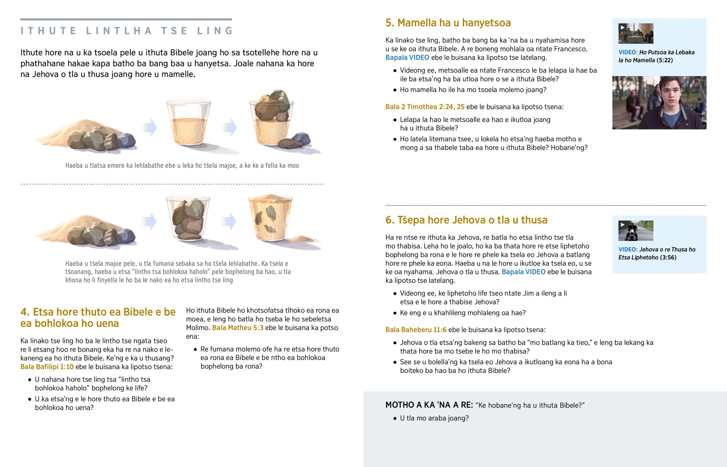 “Lentsoe la Molimo lea phela ’me le fana ka matla.” (Baheberu 4:12) Bibele ke ea bohlokoa hobane e re bolella menahano ea Molimo le tsela eo a ikutloang ka eona ka uena. E tla u thusa hore u be le tsebo, u be bohlale hape u be le tšepo. Habohlokoa le ho feta, Bibele e u thusa hore u be motsoalle oa Jehova. Ha u ithuta Bibele, u e lumella hore e fetole bophelo ba hao.