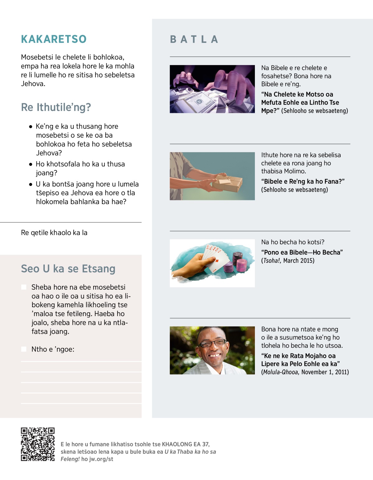 Molimo o batla hore re thabele mosebetsi oa rona. Bibele e re “ho motho ha ho letho le molemo ho feta hore a . . . bone se molemo ka lebaka la mosebetsi oa hae o boima.” (Moeklesia 2:24) Jehova o sebetsa ka thata. Ha re mo etsisa ka hore le rona re sebetse ka thata, re tla mo thabisa hape re tla khotsofala.