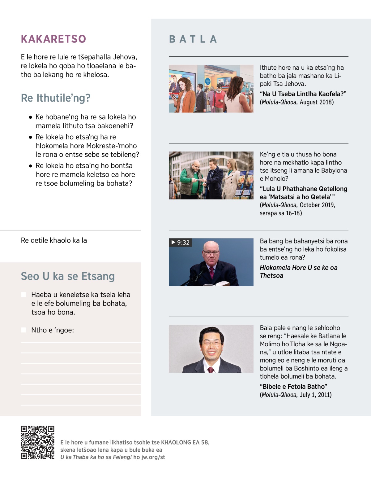 Bala pale e nang le sehlooho se reng: “Haesale ke Batlana le Molimo ho Tloha ke sa le Ngoana,” u utloe litaba tsa ntate e mong eo e neng e le moruti oa bolumeli ba Boshinto ea ileng a tlohela bolumeli ba bohata.