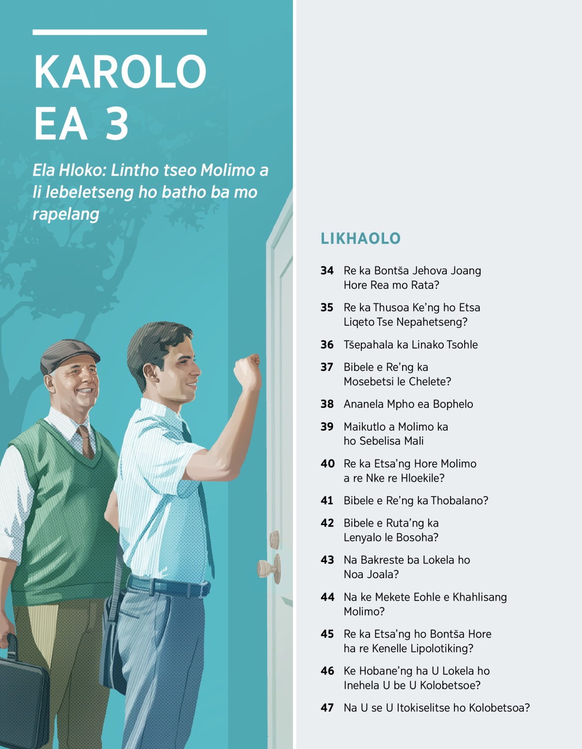 Karolo ea 3 E Hatisitsoeng Ela Hloko: Lintho tseo Molimo a li lebeletseng ho batho ba mo rapelang LIKHAOLO 34 Re ka Bontša Jehova Joang Hore Rea mo Rata? 35 Re ka Thusoa Ke’ng ho Etsa Liqeto Tse Nepahetseng? 36 Tšepahala ka Linako Tsohle 37 Bibele e Re’ng ka Mosebetsi le Chelete? 38 Ananela Mpho ea Bophelo 39 Maikutlo a Molimo ka ho Sebelisa Mali 40 Re ka Etsa’ng Hore Molimo a re Nke re Hloekile? 41 Bibele e Re’ng ka Thobalano? 42 Bibele e Ruta’ng ka Lenyalo le Bosoha? 43 Na Bakreste ba Lokela ho Noa Joala? 44 Na ke Mekete Eohle e Khahlisang Molimo? 45 Re ka Etsa’ng ho Bontša Hore ha re Kenelle Lipolotiking? 46 Ke Hobane’ng ha U Lokela ho Inehela U be U Kolobetsoe? 47 Na U se U Itokiselitse ho Kolobetsoa?