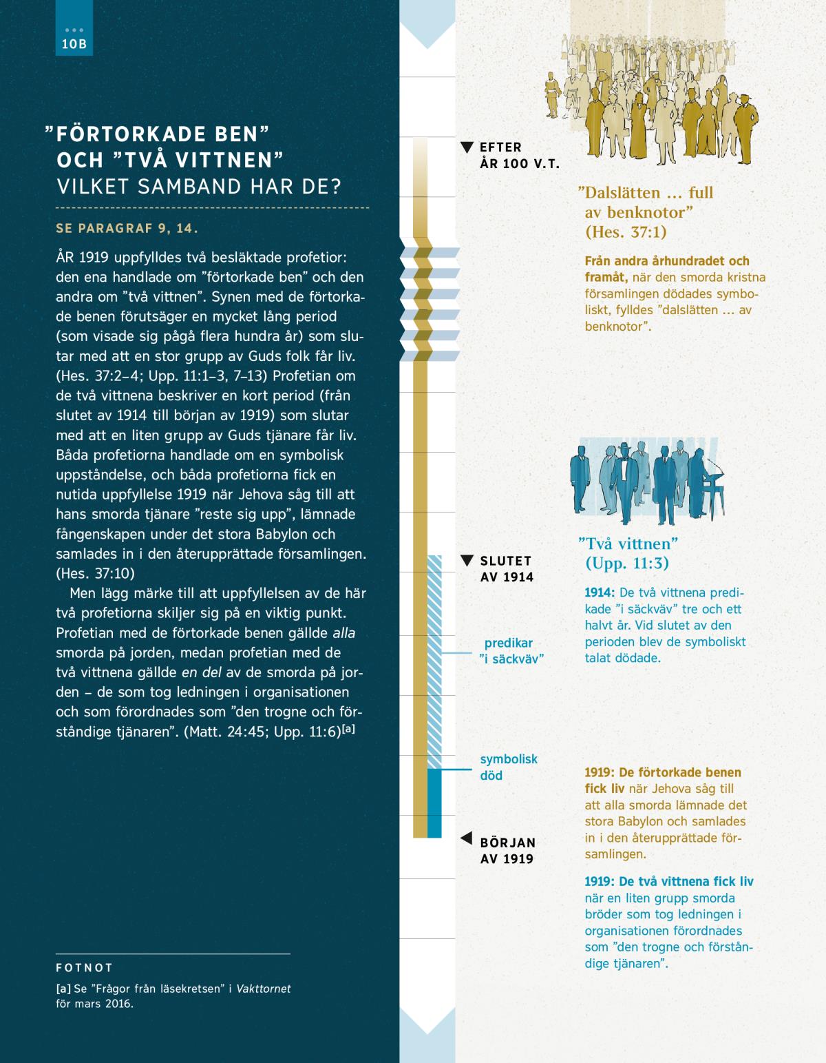 Men lägg märke till att uppfyllelsen av de här två profetiorna skiljer sig på en viktig punkt. Profetian med de förtorkade benen gällde alla smorda på jorden, medan profetian med de två vittnena gällde en del av de smorda på jorden – de som tog ledningen i organisationen och som förordnades som ”den trogne och förståndige tjänaren”. (Matt. 24:45; Upp. 11:6)a