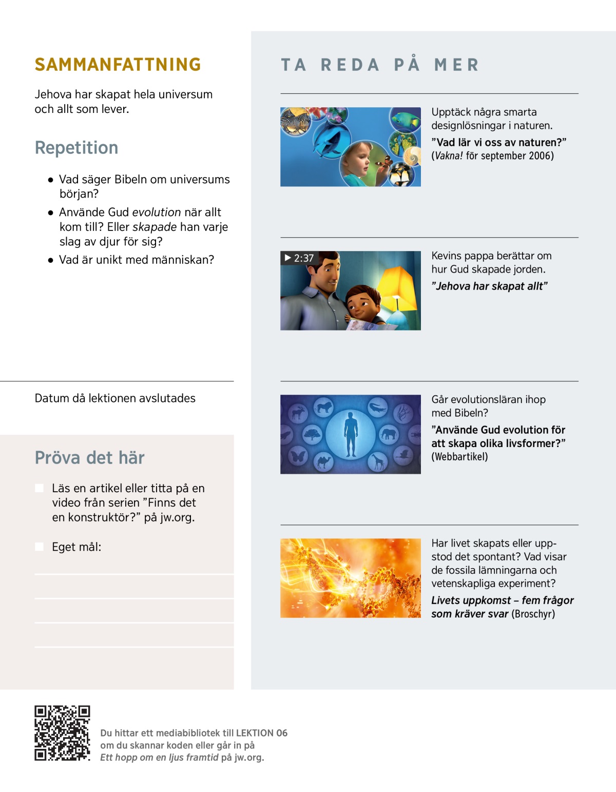 Bibeln säger att Gud ”har skapat allt”. (Uppenbarelseboken 4:11) Tror du det? En del tror att liv uppstod spontant. Det skulle i så fall betyda att du och jag finns till på grund av tillfälligheter. Men om Jehova Gud har skapat liv så borde det finnas en mening med det, eller hur?a I den här lektionen kommer du att få reda på vad Bibeln säger om livets uppkomst och varför det är rimligt att tro på det.