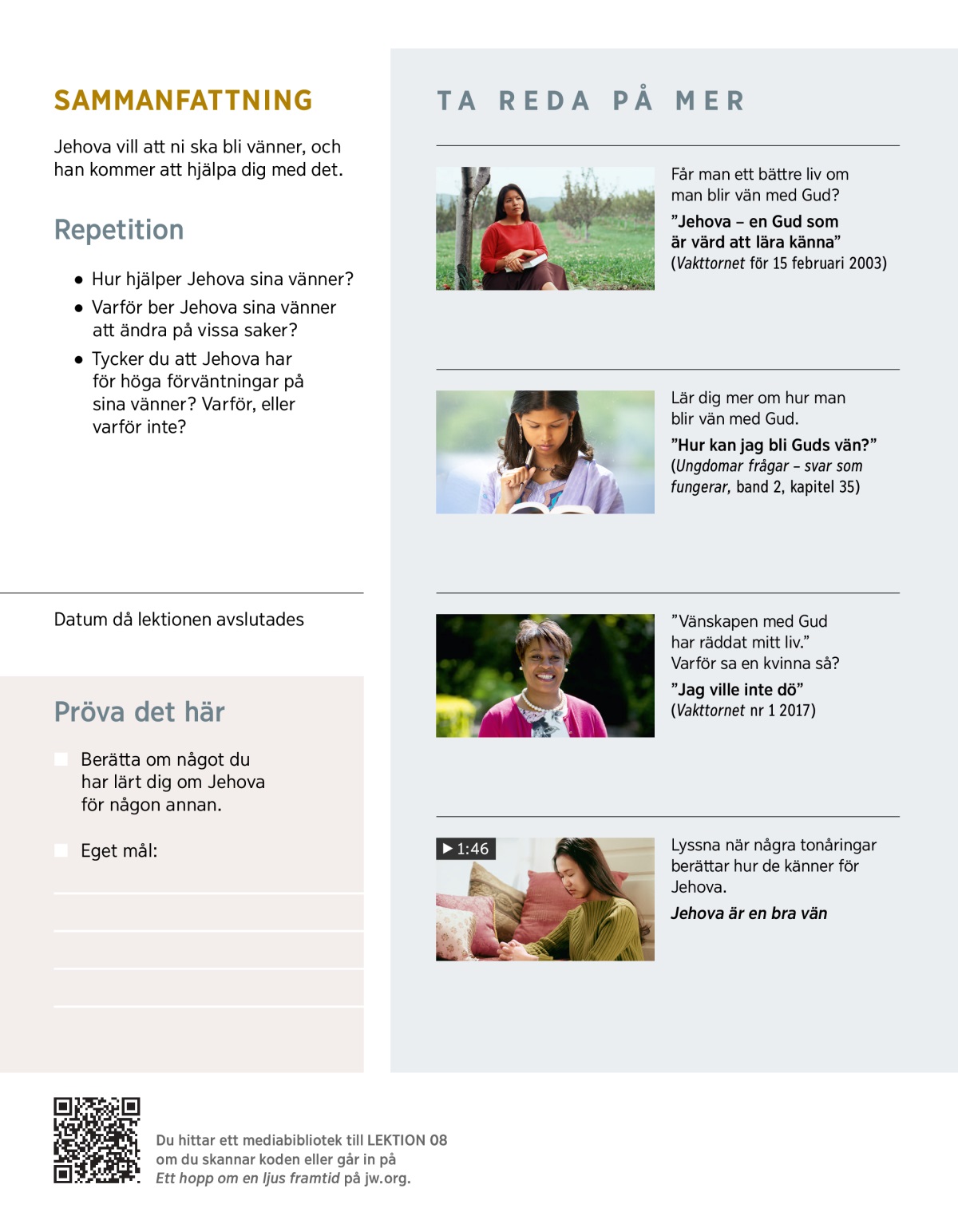 Jehova vill att du ska lära dig mer om honom. Han vill att du ska lära dig mer om hans personlighet, hur han behandlar andra och vad han ska göra i framtiden. Varför då? För att han hoppas att det ska få dig att vilja bli hans vän. Men kan man verkligen bli vän med Gud? (Läs Psalm 25:14.) Hur gör man för att bli hans vän? Svaren på de frågorna finns i Bibeln, och den visar också varför Jehova är den bästa vän du kan få.