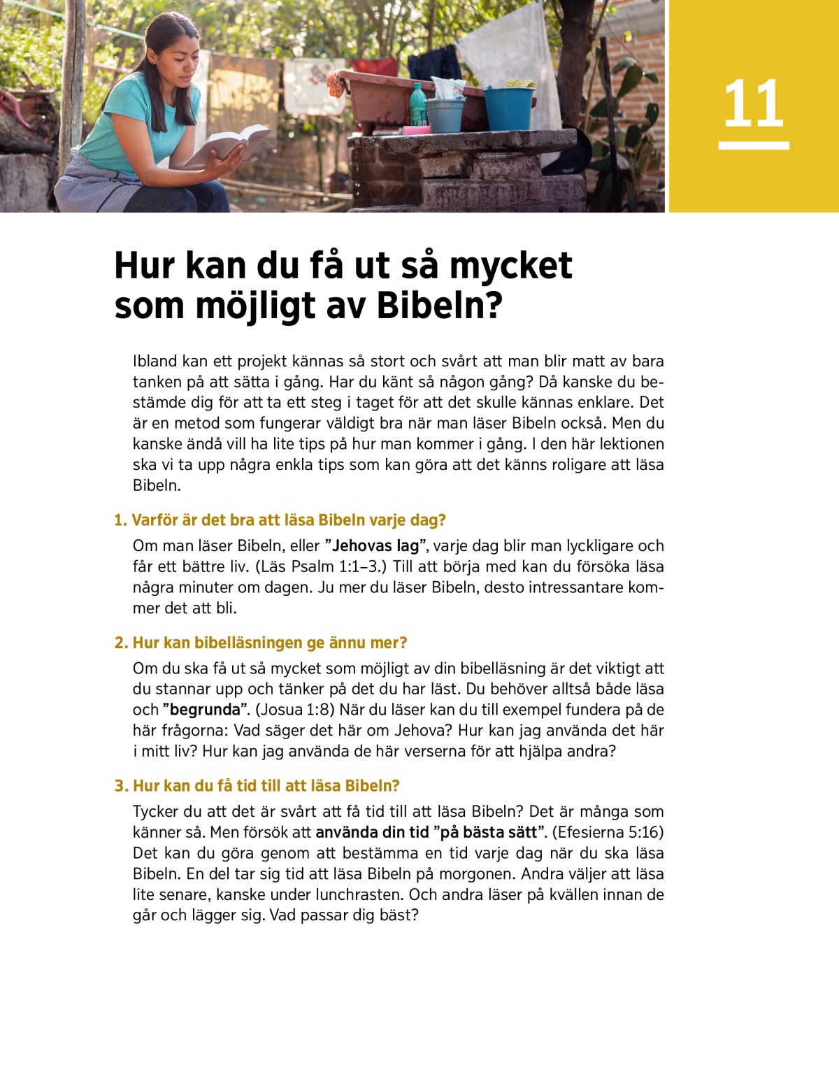 Om man läser Bibeln, eller ”Jehovas lag”, varje dag blir man lyckligare och får ett bättre liv. (Läs Psalm 1:1–3.) Till att börja med kan du försöka läsa några minuter om dagen. Ju mer du läser Bibeln, desto intressantare kommer det att bli.