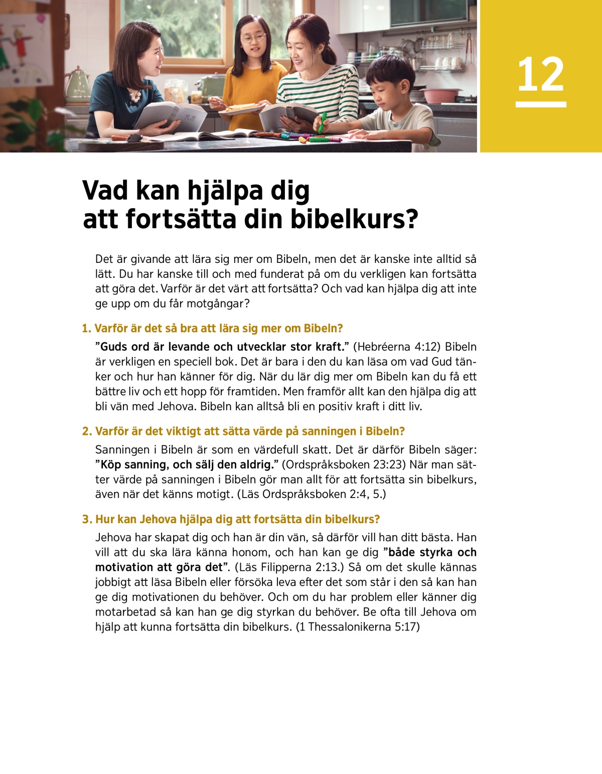 Sanningen i Bibeln är som en värdefull skatt. Det är därför Bibeln säger: ”Köp sanning, och sälj den aldrig.” (Ordspråksboken 23:23) När man sätter värde på sanningen i Bibeln gör man allt för att fortsätta sin bibelkurs, även när det känns motigt. (Läs Ordspråksboken 2:4, 5.)