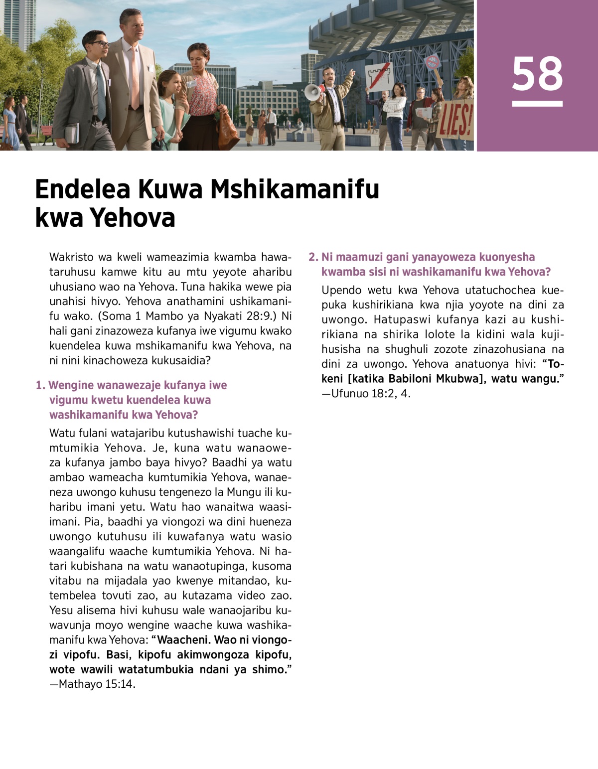 Watu fulani watajaribu kutushawishi tuache kumtumikia Yehova. Je, kuna watu wanaoweza kufanya jambo baya hivyo? Baadhi ya watu ambao wameacha kumtumikia Yehova, wanaeneza uwongo kuhusu tengenezo la Mungu ili kuharibu imani yetu. Watu hao wanaitwa waasi-imani. Pia, baadhi ya viongozi wa dini hueneza uwongo kutuhusu ili kuwafanya watu wasio waangalifu waache kumtumikia Yehova. Ni hatari kubishana na watu wanaotupinga, kusoma vitabu na mijadala yao kwenye mitandao, kutembelea tovuti zao, au kutazama video zao. Yesu alisema hivi kuhusu wale wanaojaribu kuwavunja moyo wengine waache kuwa washikamanifu kwa Yehova: “Waacheni. Wao ni viongozi vipofu. Basi, kipofu akimwongoza kipofu, wote wawili watatumbukia ndani ya shimo.”—Mathayo 15:14.