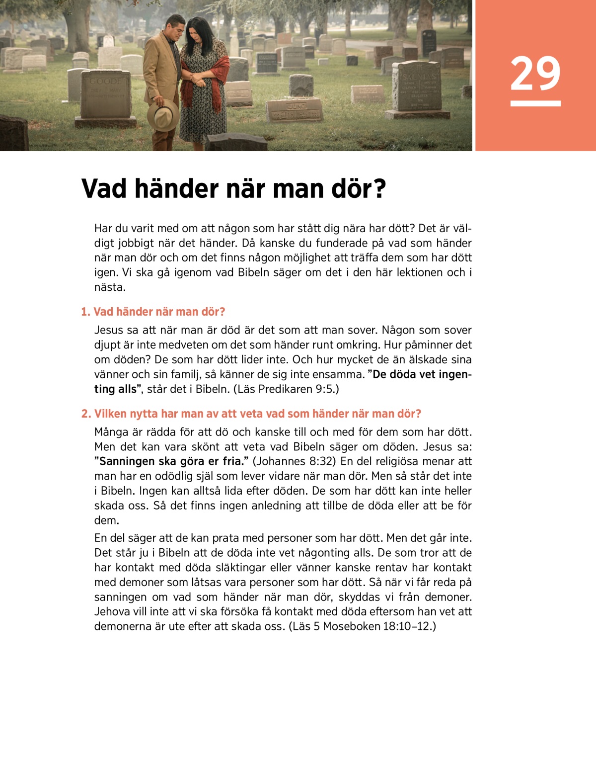 Har du varit med om att någon som har stått dig nära har dött? Det är väldigt jobbigt när det händer. Då kanske du funderade på vad som händer när man dör och om det finns någon möjlighet att träffa dem som har dött igen. Vi ska gå igenom vad Bibeln säger om det i den här lektionen och i nästa.