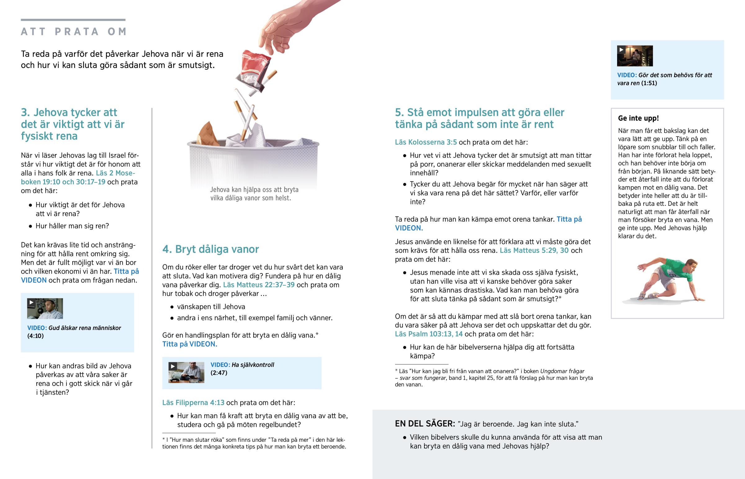 Finns det något mer som skulle kunna smutsa ner oss eller våra tankar? Ja. Vi undviker till exempel att röka, snusa, ta droger och tugga betelnöt eller kokablad eftersom det kan skada vår kropp. Det gör att vi får bättre hälsa och visar att vi uppskattar att vi har fått livet. Vi vill också hålla våra tankar rena, så vi anstränger oss för att inte onanera och titta på porr. (Psalm 119:37; Efesierna 5:5) Det kan vara svårt att sluta med sådant, men det går med Jehovas hjälp. (Läs Jesaja 41:13.)