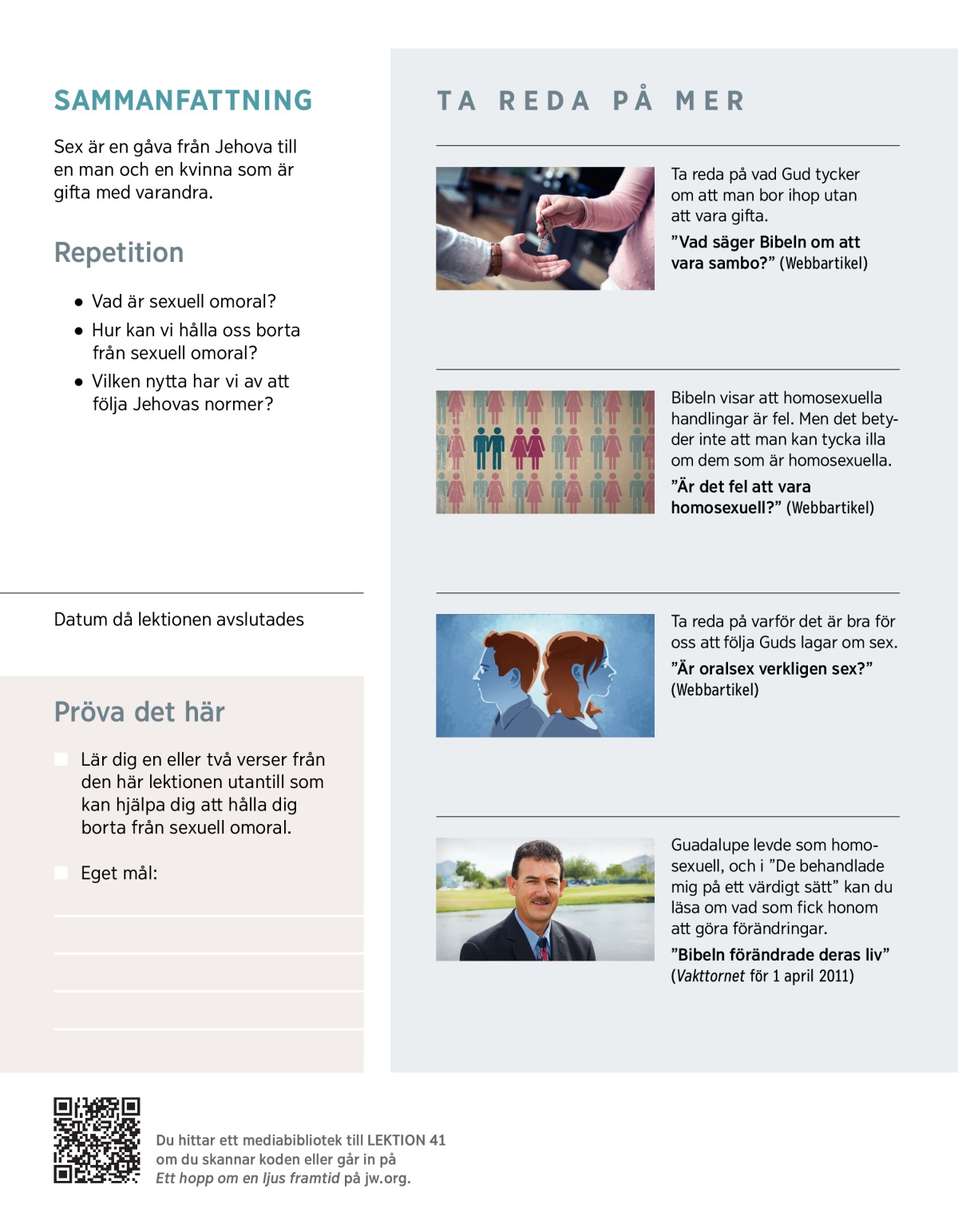 En del tycker att det Bibeln säger om homosexuella handlingar är hårt och kärlekslöst. Men Jehova är kärlekens Gud, och han vill att alla ska må bra för all framtid. Han ger evigt liv till alla som följer hans normer. Läs 1 Korinthierna 6:9–11 och prata om det här: