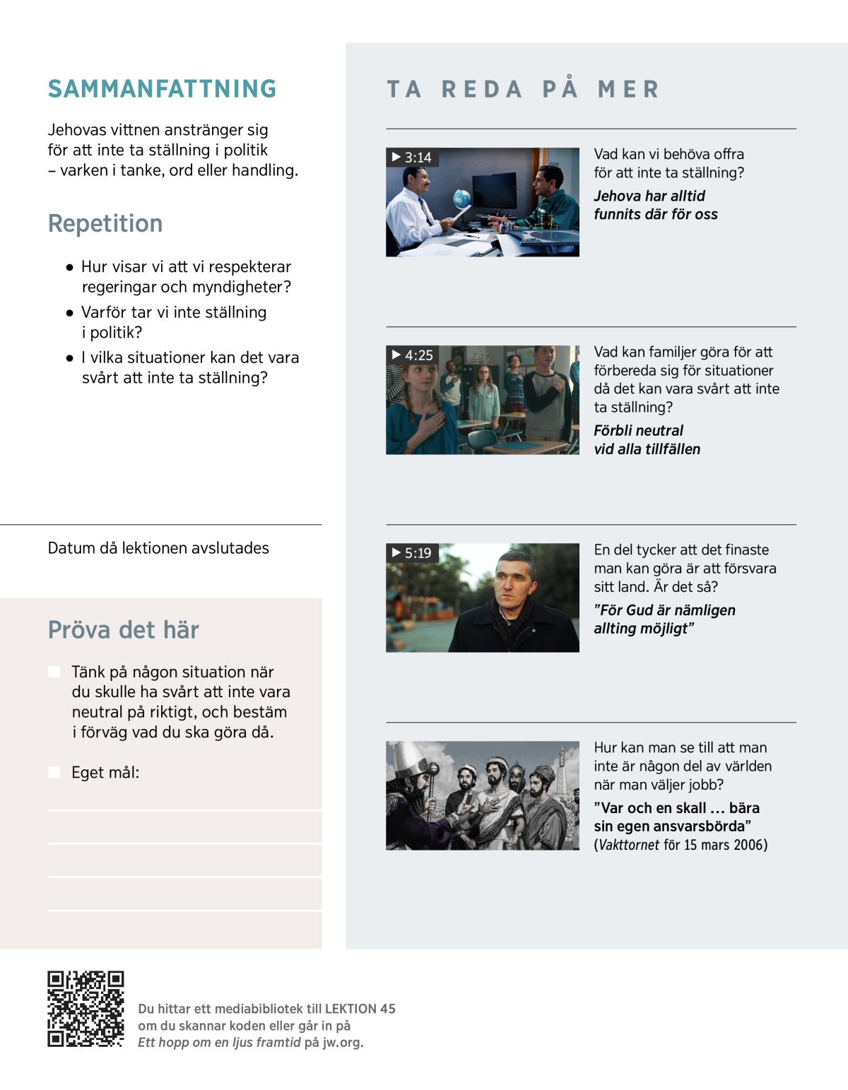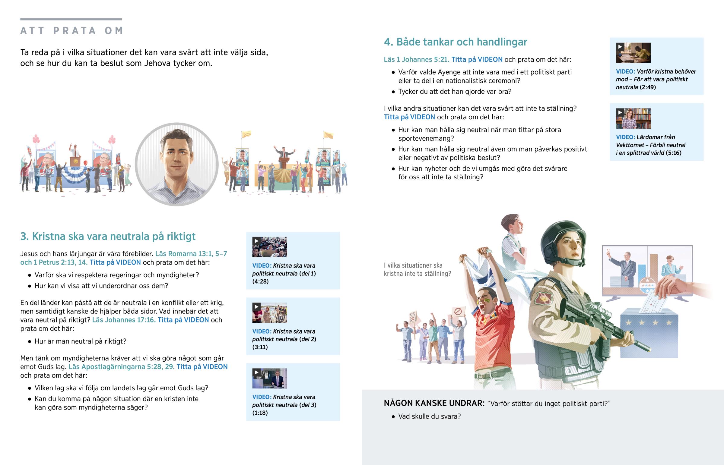 En del länder kan påstå att de är neutrala i en konflikt eller ett krig, men samtidigt kanske de hjälper båda sidor. Vad innebär det att vara neutral på riktigt? Läs Johannes 17:16. Titta på VIDEON och prata om frågan nedan.