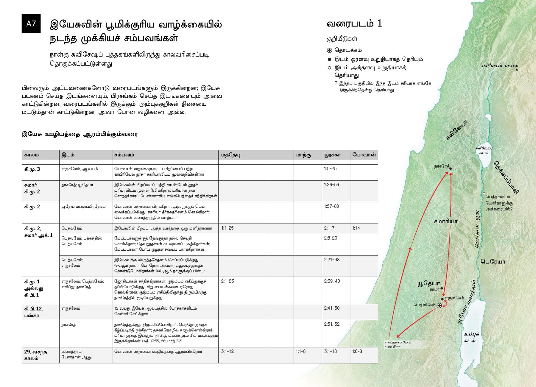 பின்வரும் அட்டவணைகளோடு வரைபடங்களும் இருக்கின்றன; இயேசு பயணம் செய்த இடங்களையும், பிரசங்கம் செய்த இடங்களையும் அவை காட்டுகின்றன. வரைபடங்களில் இருக்கும் அம்புக்குறிகள் திசையை மட்டும்தான் காட்டுகின்றன, அவர் போன வழிகளை அல்ல.