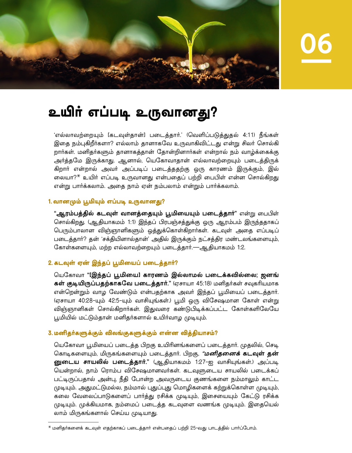 ‘எல்லாவற்றையும் [கடவுள்தான்] படைத்தார்.’ (வெளிப்படுத்துதல் 4:11) நீங்கள் இதை நம்புகிறீர்களா? எல்லாம் தானாகவே உருவாகிவிட்டது என்று சிலர் சொல்கிறார்கள். மனிதர்களும் தானாகத்தான் தோன்றினார்கள் என்றால் நம் வாழ்க்கைக்கு அர்த்தமே இருக்காது. ஆனால், யெகோவாதான் எல்லாவற்றையும் படைத்திருக்கிறார் என்றால் அவர் அப்படிப் படைத்ததற்கு ஒரு காரணம் இருக்கும், இல்லையா?a உயிர் எப்படி உருவானது என்பதைப் பற்றி பைபிள் என்ன சொல்கிறது என்று பார்க்கலாம். அதை நாம் ஏன் நம்பலாம் என்றும் பார்க்கலாம்.