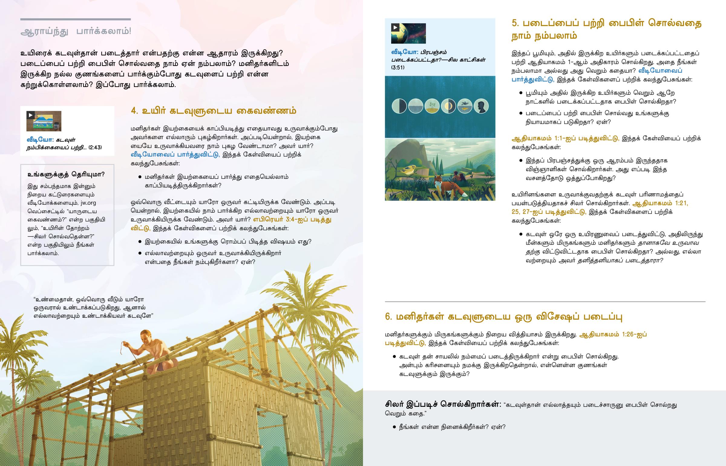 உயிரைக் கடவுள்தான் படைத்தார் என்பதற்கு என்ன ஆதாரம் இருக்கிறது? படைப்பைப் பற்றி பைபிள் சொல்வதை நாம் ஏன் நம்பலாம்? மனிதர்களிடம் இருக்கிற நல்ல குணங்களைப் பார்க்கும்போது கடவுளைப் பற்றி என்ன கற்றுக்கொள்ளலாம்? இப்போது பார்க்கலாம்.