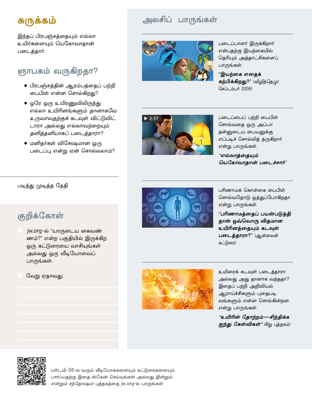 இந்தப் பூமியும், அதில் இருக்கிற உயிர்களும் படைக்கப்பட்டதைப் பற்றி ஆதியாகமம் 1-ஆம் அதிகாரம் சொல்கிறது. அதை நீங்கள் நம்பலாமா அல்லது அது வெறும் கதையா? வீடியோவைப் பார்த்துவிட்டு, இந்தக் கேள்விகளைப் பற்றிக் கலந்துபேசுங்கள்: