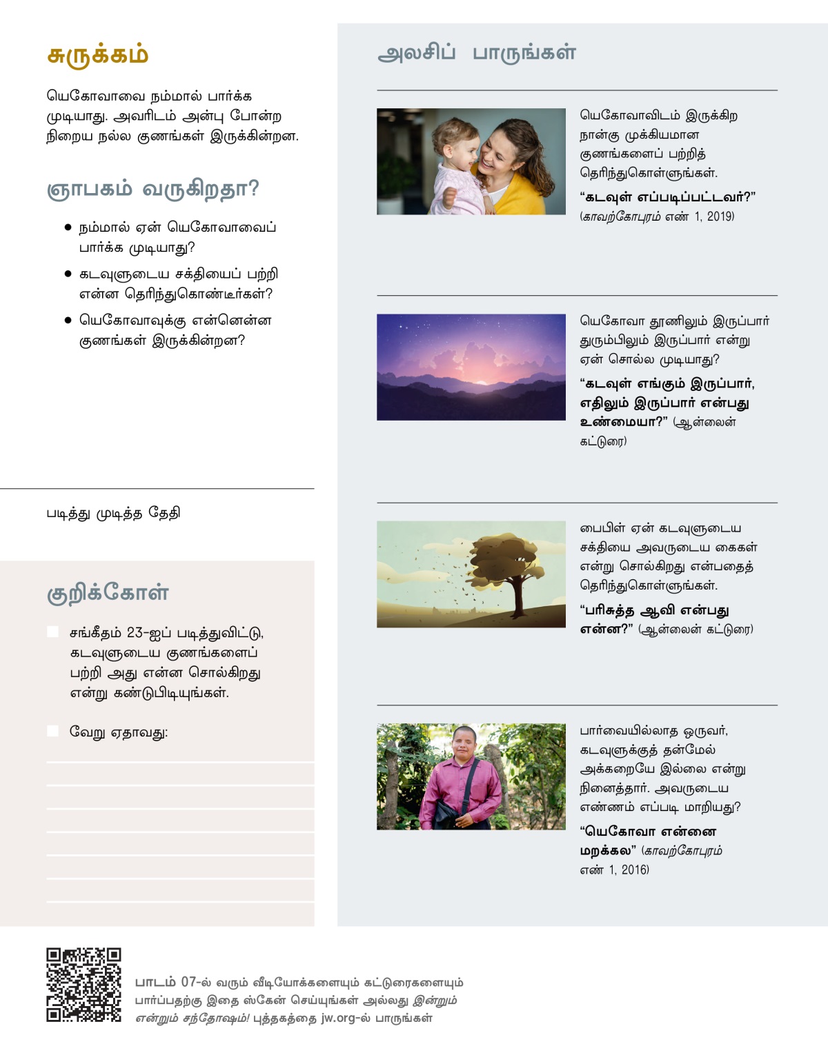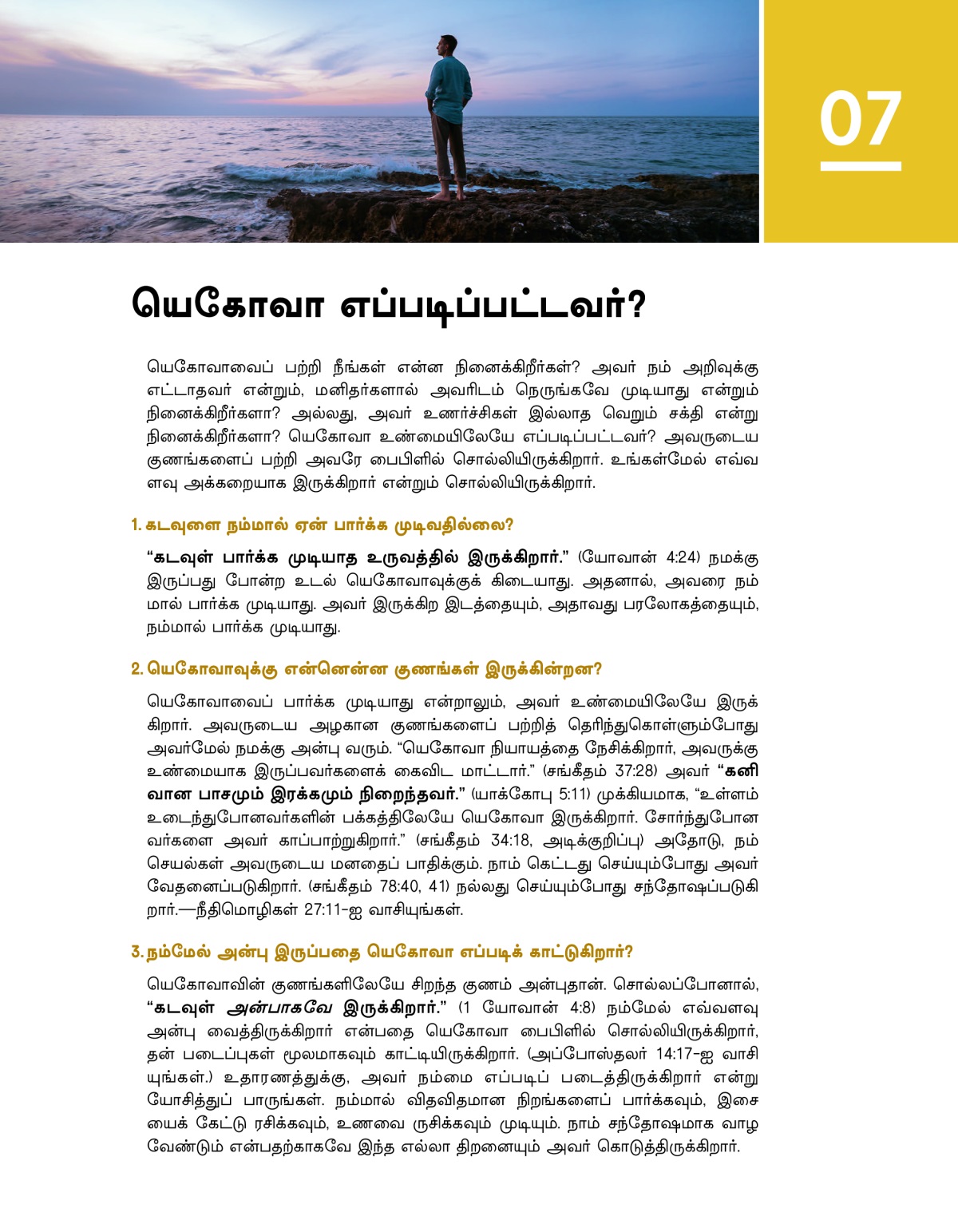 யெகோவாவைப் பற்றி நீங்கள் என்ன நினைக்கிறீர்கள்? அவர் நம் அறிவுக்கு எட்டாதவர் என்றும், மனிதர்களால் அவரிடம் நெருங்கவே முடியாது என்றும் நினைக்கிறீர்களா? அல்லது, அவர் உணர்ச்சிகள் இல்லாத வெறும் சக்தி என்று நினைக்கிறீர்களா? யெகோவா உண்மையிலேயே எப்படிப்பட்டவர்? அவருடைய குணங்களைப் பற்றி அவரே பைபிளில் சொல்லியிருக்கிறார். உங்கள்மேல் எவ்வளவு அக்கறையாக இருக்கிறார் என்றும் சொல்லியிருக்கிறார்.