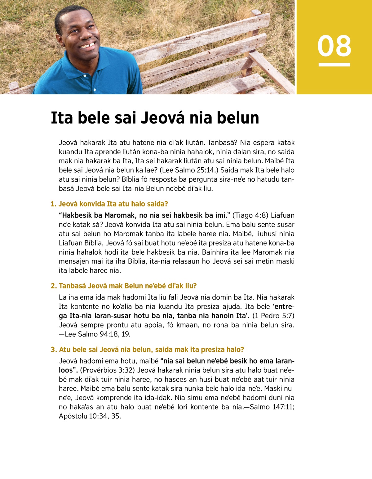 Jeová hakarak Ita atu hatene nia diʼak liután. Tanbasá? Nia espera katak kuandu Ita aprende liután kona-ba ninia hahalok, ninia dalan sira, no saida mak nia hakarak ba Ita, Ita sei hakarak liután atu sai ninia belun. Maibé Ita bele sai Jeová nia belun ka lae? (Lee Salmo 25:14.) Saida mak Ita bele halo atu sai ninia belun? Bíblia fó resposta ba pergunta sira-neʼe no hatudu tanbasá Jeová bele sai Ita-nia Belun neʼebé diʼak liu.