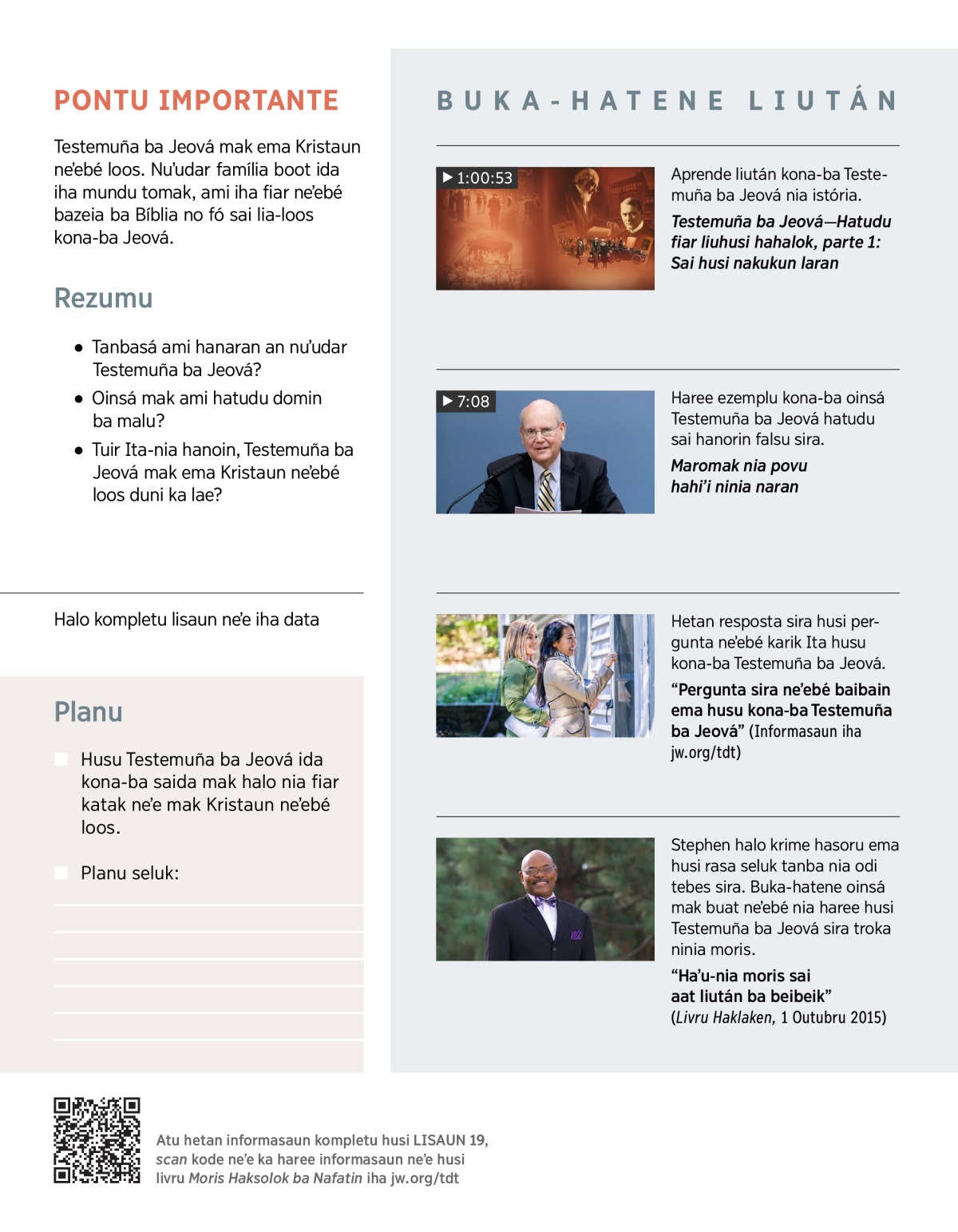 “Pergunta sira neʼebé baibain ema husu kona-ba Testemuña ba Jeová” (Informasaun iha jw.org/tdt)