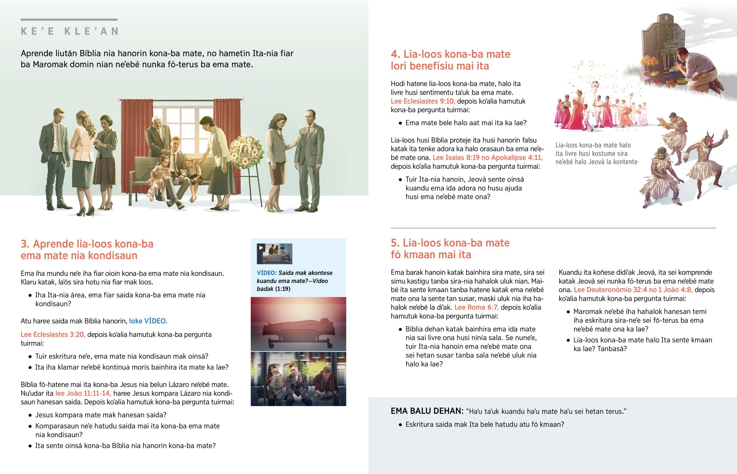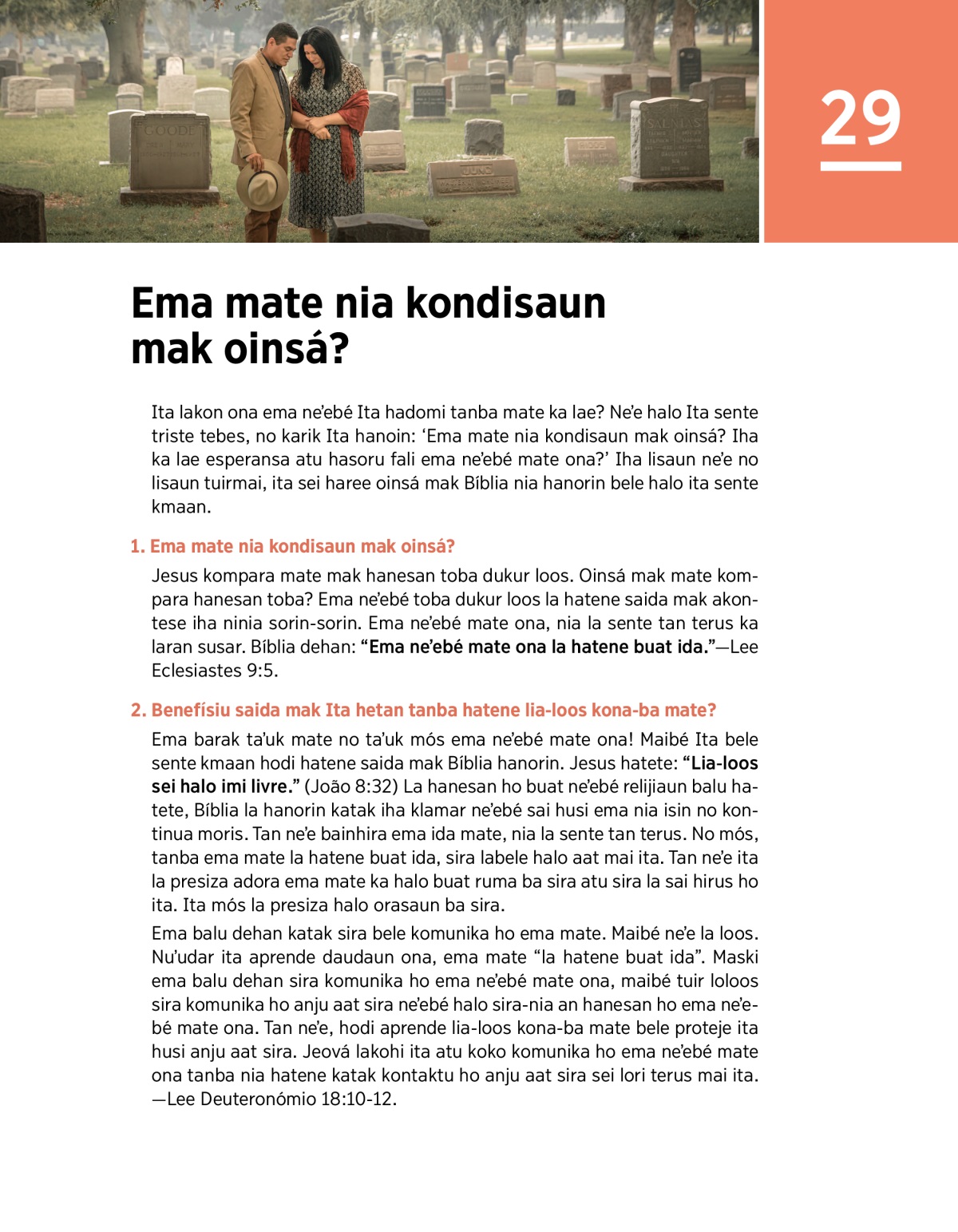Ita lakon ona ema neʼebé Ita hadomi tanba mate ka lae? Neʼe halo Ita sente triste tebes, no karik Ita hanoin: ‘Ema mate nia kondisaun mak oinsá? Iha ka lae esperansa atu hasoru fali ema neʼebé mate ona?’ Iha lisaun neʼe no lisaun tuirmai, ita sei haree oinsá mak Bíblia nia hanorin bele halo ita sente kmaan.