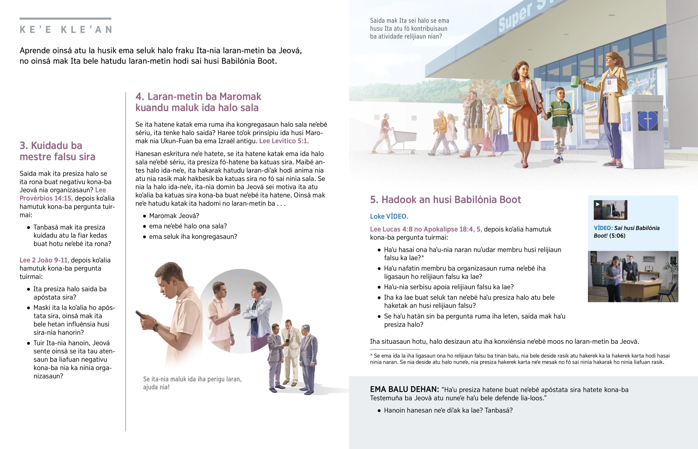 Domin ba Jeová sei book ita atu la hola parte iha relijiaun falsu. Tan neʼe, ita la envolve ho serbisu, organizasaun, ka atividade ruma neʼebé iha ligasaun ho relijiaun falsu. Jeová fó avizu mai ita: ‘Haʼu-nia povu, sai husi Babilónia Boot.’—Apokalipse 18:2, 4.