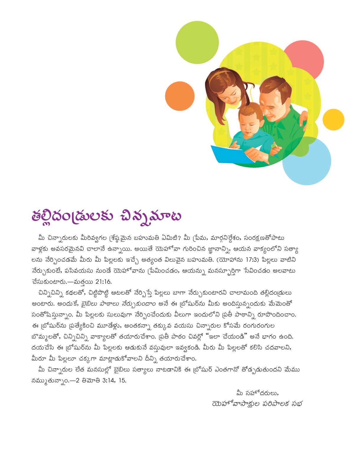 చిన్నిచిన్ని కథలతో, చిట్టిపొట్టి ఆటలతో నేర్పిస్తే పిల్లలు బాగా నేర్చుకుంటారని చాలామంది తల్లిదండ్రులు అంటారు. అందుకే, బైబిలు పాఠాలు నేర్చుకుందాం అనే ఈ బ్రోషుర్ను మీకు అందిస్తున్నందుకు మేమెంతో సంతోషిస్తున్నాం. మీ పిల్లలకు సులువుగా నేర్పించేందుకు వీలుగా ఇందులోని ప్రతీ పాఠాన్ని రూపొందించాం. ఈ బ్రోషుర్ను ప్రత్యేకించి మూడేళ్లు, అంతకన్నా తక్కువ వయసు చిన్నారుల కోసమే రంగురంగుల బొమ్మలతో, చిన్నిచిన్ని వాక్యాలతో తయారుచేశాం. ప్రతీ పాఠం చివర్లో “ఇలా చేయండి” అనే భాగం ఉంది. దయచేసి ఈ బ్రోషుర్ను మీ పిల్లలకు ఆడుకునే వస్తువులా ఇవ్వకండి. మీరు మీ పిల్లలతో కలిసి చదవాలని, మీరూ మీ పిల్లలూ చక్కగా మాట్లాడుకోవాలని దీన్ని తయారుచేశాం.