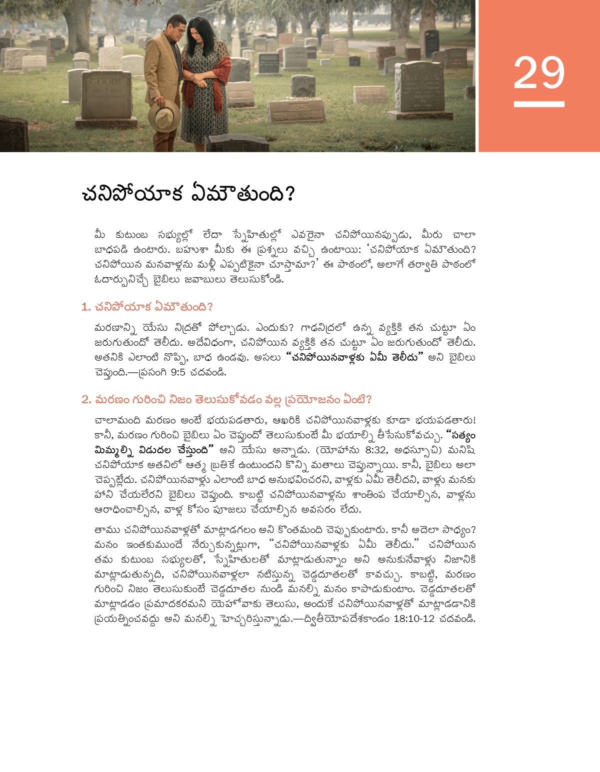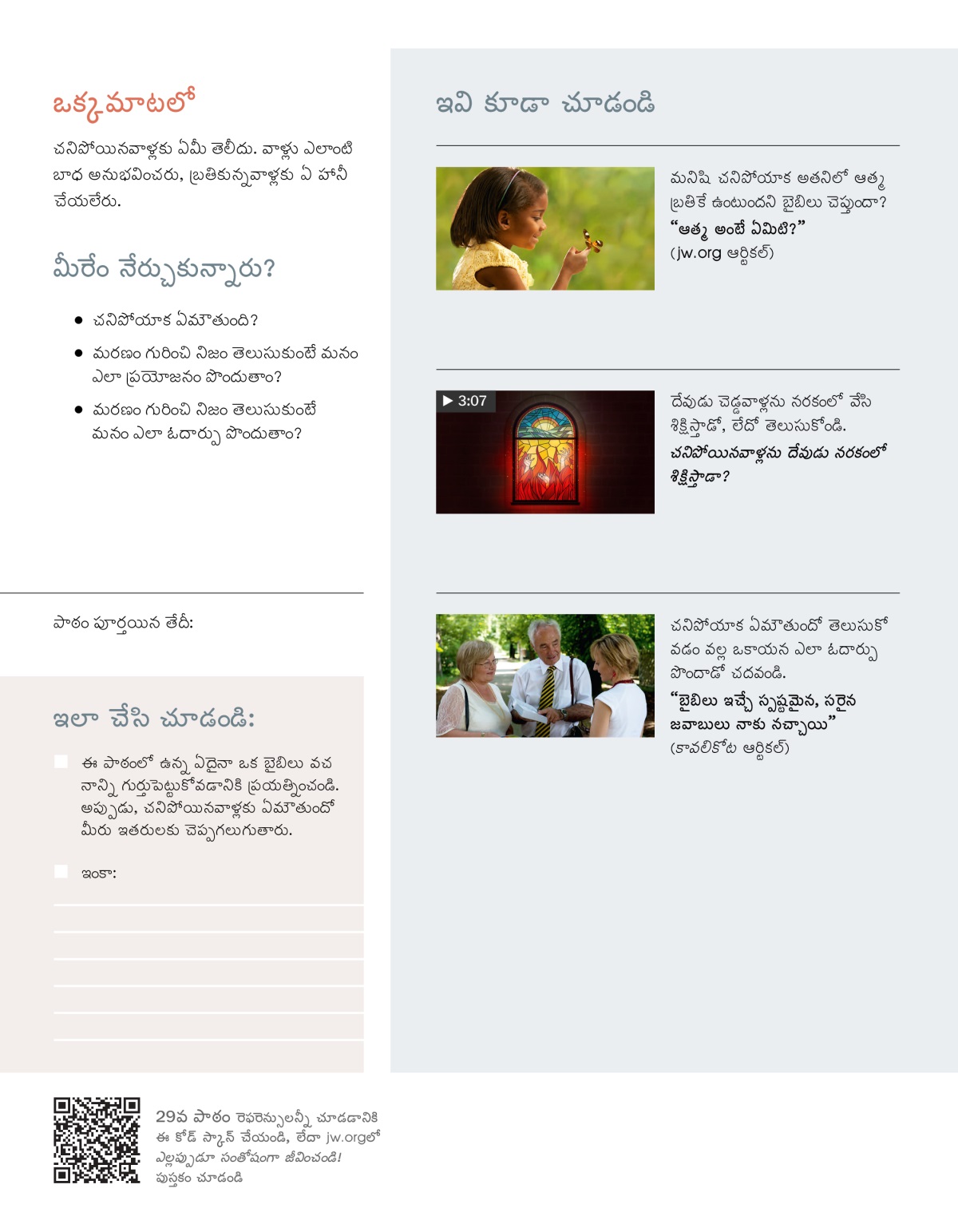 మీ కుటుంబ సభ్యుల్లో లేదా స్నేహితుల్లో ఎవరైనా చనిపోయినప్పుడు, మీరు చాలా బాధపడి ఉంటారు. బహుశా మీకు ఈ ప్రశ్నలు వచ్చి ఉంటాయి: ‘చనిపోయాక ఏమౌతుంది? చనిపోయిన మనవాళ్లను మళ్లీ ఎప్పటికైనా చూస్తామా?’ ఈ పాఠంలో, అలాగే తర్వాతి పాఠంలో ఓదార్పునిచ్చే బైబిలు జవాబులు తెలుసుకోండి.