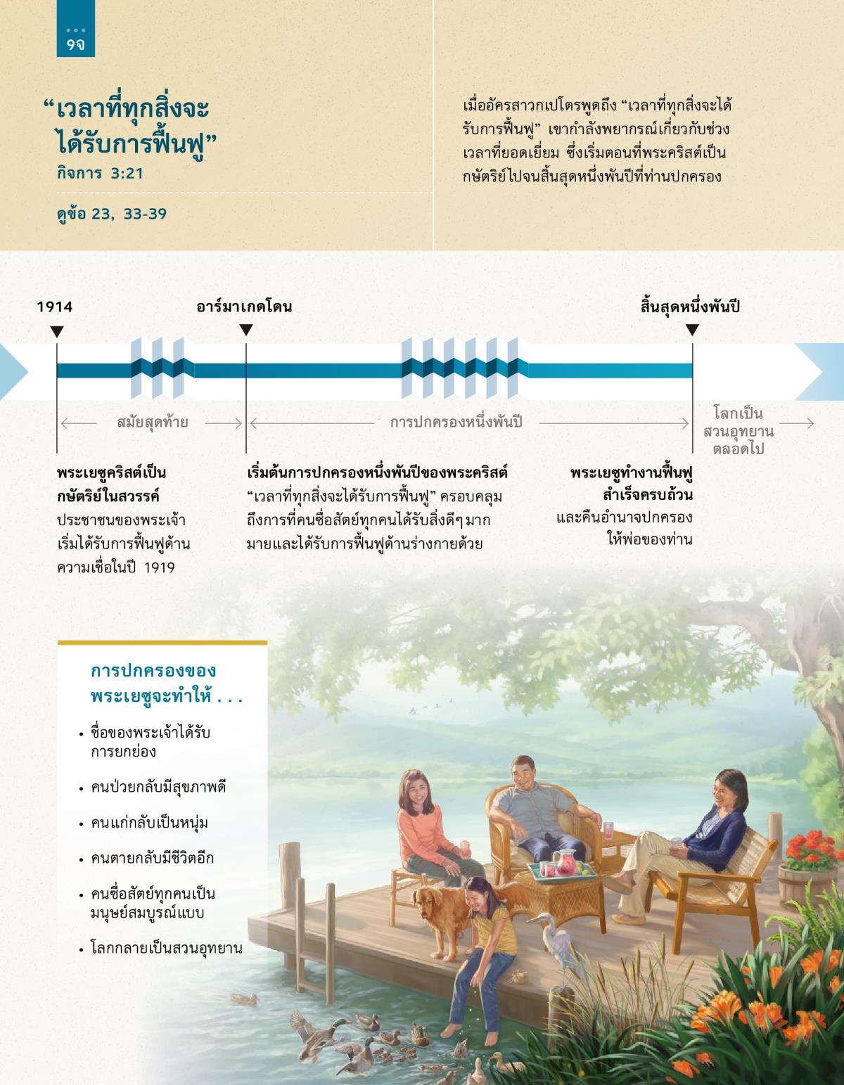 อาร์มาเกดโดน—เริ่มต้นการปกครองหนึ่งพันปีของพระคริสต์ “เวลาที่ทุกสิ่งจะได้รับการฟื้นฟู” ครอบคลุมถึงการที่คนซื่อสัตย์ทุกคนได้รับสิ่งดี ๆ มากมายและได้รับการฟื้นฟูด้านร่างกายด้วย