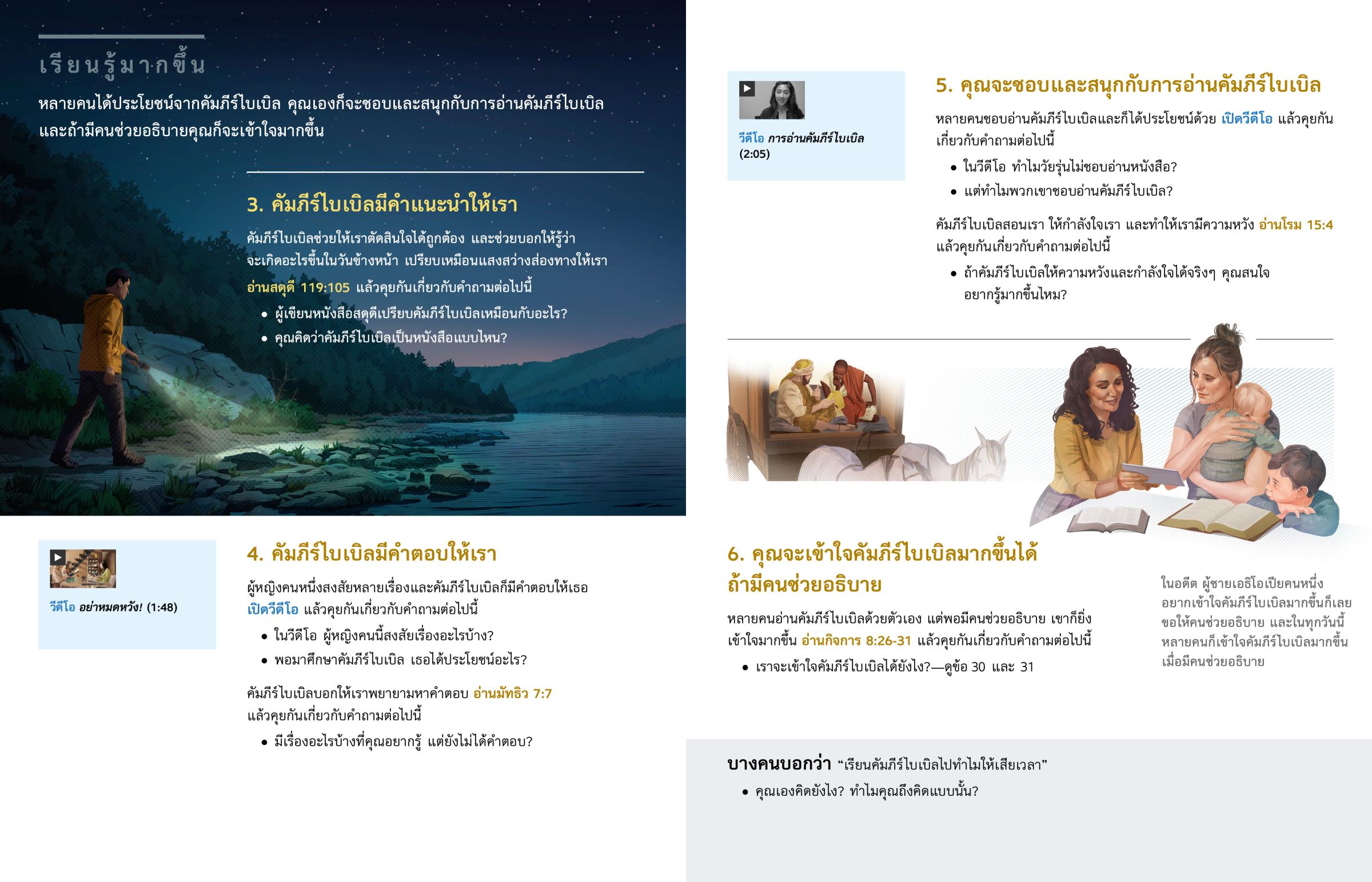หลายคนอ่านคัมภีร์ไบเบิลด้วยตัวเอง แต่พอมีคนช่วยอธิบาย เขาก็ยิ่งเข้าใจมากขึ้น อ่านกิจการ 8:26-31 แล้วคุยกันเกี่ยวกับคำถามต่อไปนี้