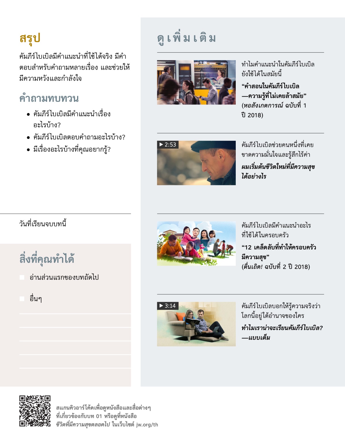 เราอาจเคยสงสัยว่า ทำไมชีวิตถึงลำบากขนาดนี้? และวันข้างหน้าจะเป็นยังไง? แต่ละวันก็มีหลายเรื่องที่เรากังวล เช่น ทำยังไงถึงจะมีเงินพอใช้? ทำยังไงครอบครัวถึงจะมีความสุข? หลายคนได้คำตอบและคำแนะนำดี ๆ จากคัมภีร์ไบเบิล คุณคิดว่าคัมภีร์ไบเบิลจะมีประโยชน์กับคุณและคนที่คุณรู้จักไหม?