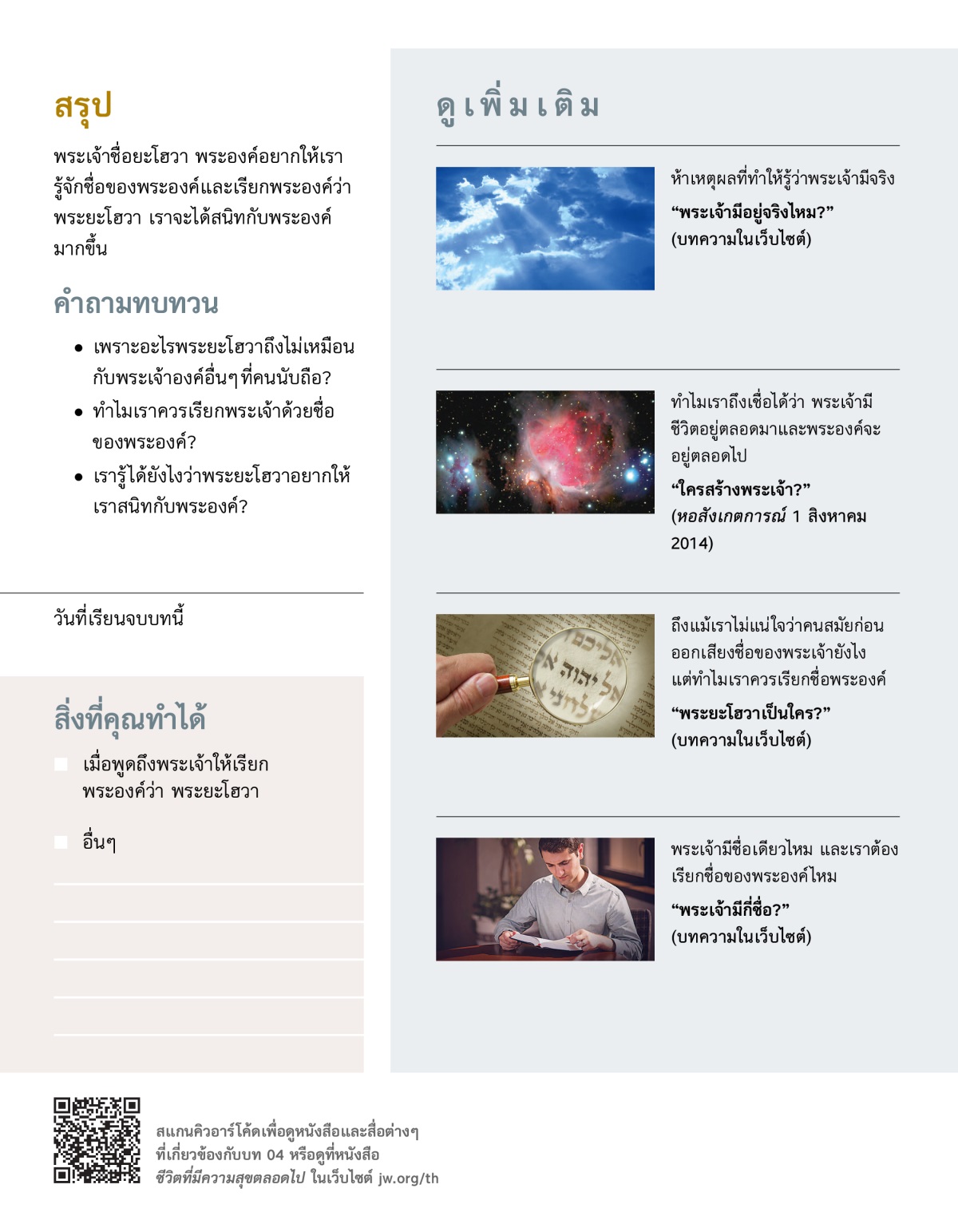 เรารู้ได้ยังไงว่าพระยะโฮวาอยากให้เรารู้จักชื่อของพระองค์ เปิดวีดีโอ แล้วคุยกันเกี่ยวกับคำถามต่อไปนี้