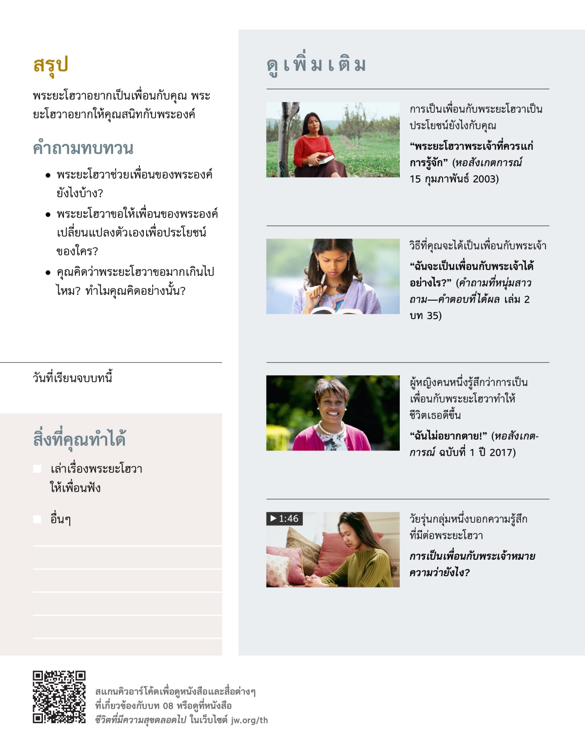 พระยะโฮวาอยากให้คุณรู้จักพระองค์มากขึ้นและเป็นเพื่อนกับพระองค์ ถ้าคุณรู้ว่าพระยะโฮวาเป็นพระเจ้าแบบไหน เคยทำอะไรมาบ้าง และอยากจะให้อะไรกับคุณ คุณก็คงอยากจะเป็นเพื่อนกับพระองค์ แต่คุณจะเป็นเพื่อนกับพระเจ้าได้จริง ๆ ไหม? (อ่านสดุดี 25:14) คุณต้องทำอะไรเพื่อจะเป็นเพื่อนกับพระองค์? คัมภีร์ไบเบิลมีคำตอบ และยังบอกด้วยว่าทำไมพระยะโฮวาถึงเป็นเพื่อนที่ดีที่สุด