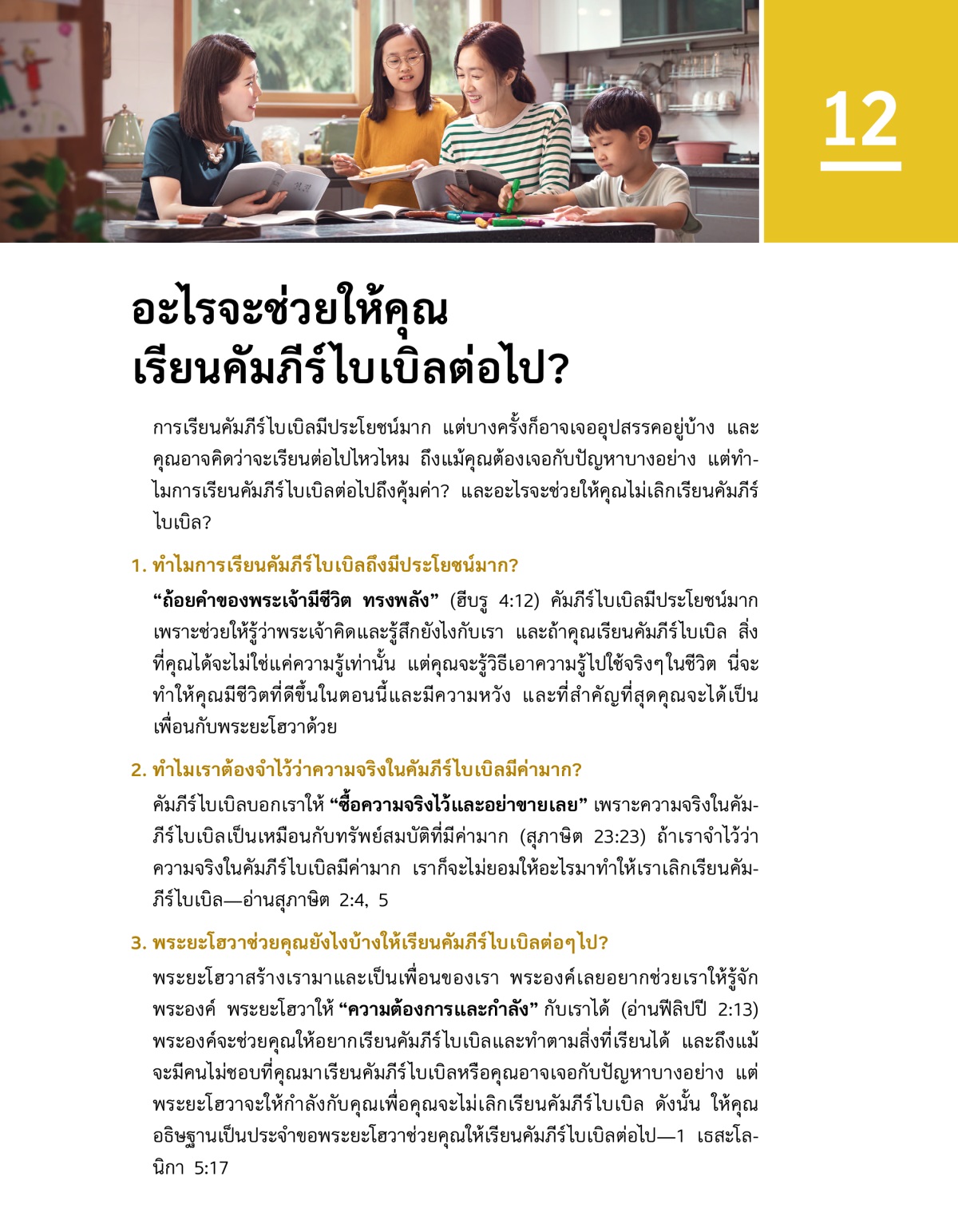 “ถ้อยคำของพระเจ้ามีชีวิต ทรงพลัง” (ฮีบรู 4:12) คัมภีร์ไบเบิลมีประโยชน์มากเพราะช่วยให้รู้ว่าพระเจ้าคิดและรู้สึกยังไงกับเรา และถ้าคุณเรียนคัมภีร์ไบเบิล สิ่งที่คุณได้จะไม่ใช่แค่ความรู้เท่านั้น แต่คุณจะรู้วิธีเอาความรู้ไปใช้จริง ๆ ในชีวิต นี่จะทำให้คุณมีชีวิตที่ดีขึ้นในตอนนี้และมีความหวัง และที่สำคัญที่สุดคุณจะได้เป็นเพื่อนกับพระยะโฮวาด้วย