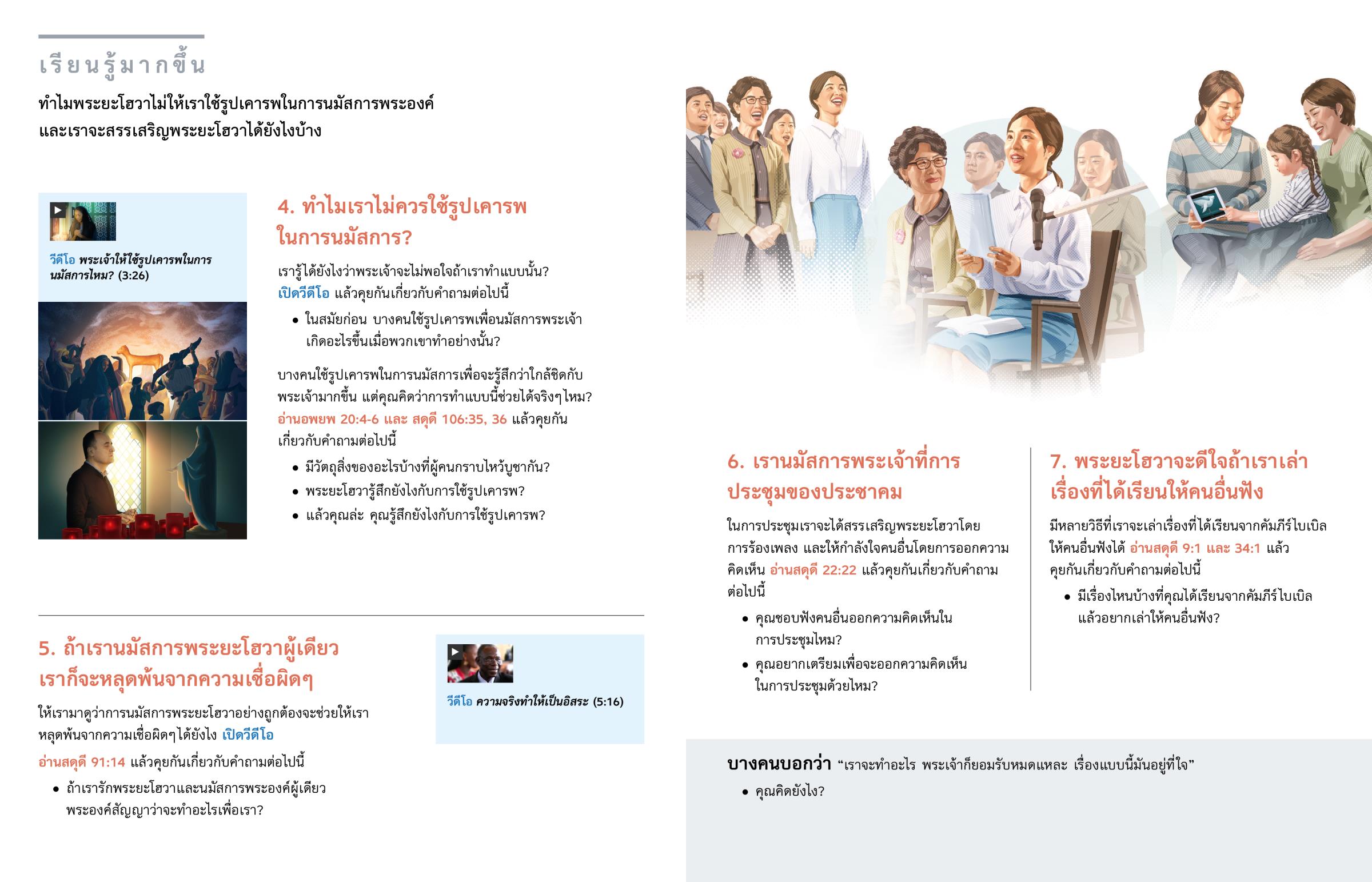 บางคนใช้รูปเคารพในการนมัสการเพื่อจะรู้สึกว่าใกล้ชิดกับพระเจ้ามากขึ้น แต่คุณคิดว่าการทำแบบนี้ช่วยได้จริง ๆ ไหม? อ่านอพยพ 20:4-6 และ สดุดี 106:35, 36 แล้วคุยกันเกี่ยวกับคำถามต่อไปนี้