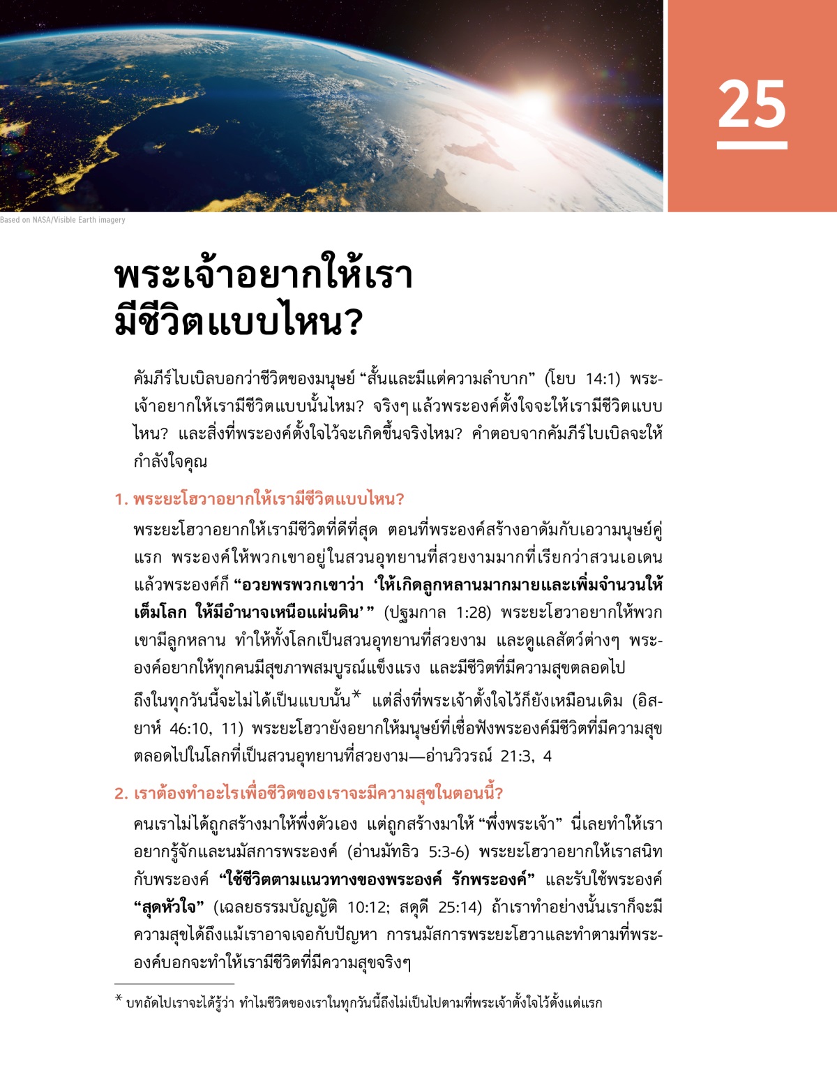 คัมภีร์ไบเบิลบอกว่าชีวิตของมนุษย์ “สั้นและมีแต่ความลำบาก” (โยบ 14:1) พระเจ้าอยากให้เรามีชีวิตแบบนั้นไหม? จริง ๆ แล้วพระองค์ตั้งใจจะให้เรามีชีวิตแบบไหน? และสิ่งที่พระองค์ตั้งใจไว้จะเกิดขึ้นจริงไหม? คำตอบจากคัมภีร์ไบเบิลจะให้กำลังใจคุณ