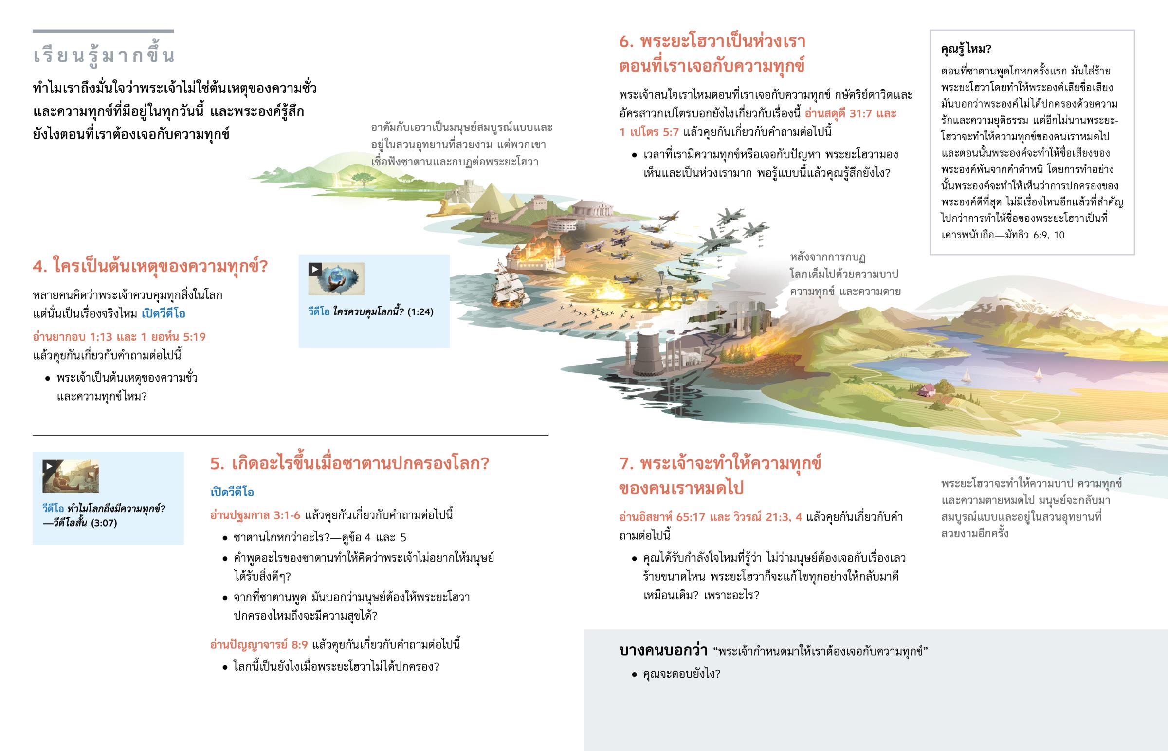 ซาตานกับมนุษย์คู่แรกเป็นต้นเหตุที่ทำให้มีความชั่วในโลกนี้ พระยะโฮวาเป็นห่วงเรามากตอนที่เราเจอกับความทุกข์ และอีกไม่นานพระองค์จะทำให้ความทุกข์หมดไป