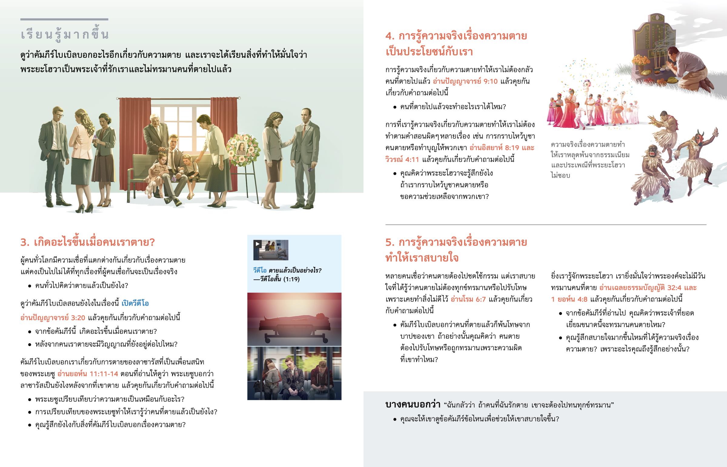 ดูว่าคัมภีร์ไบเบิลบอกอะไรอีกเกี่ยวกับความตาย และเราจะได้เรียนสิ่งที่ทำให้มั่นใจว่าพระยะโฮวาเป็นพระเจ้าที่รักเราและไม่ทรมานคนที่ตายไปแล้ว