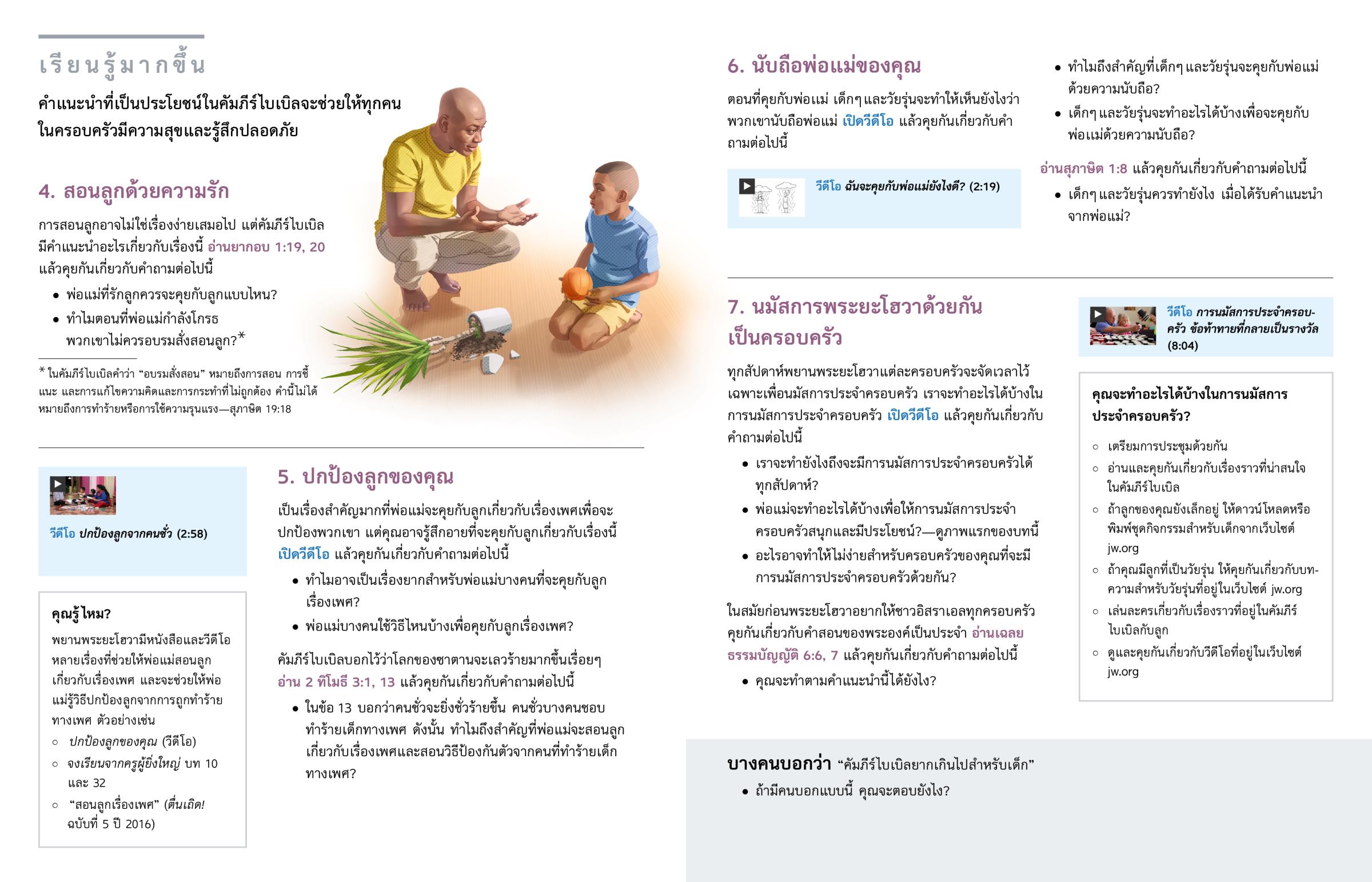 ลูกเป็นเหมือนของขวัญที่มาจากพระยะโฮวา และพระองค์ก็อยากให้พ่อแม่ดูแลของขวัญนี้อย่างดี พระองค์เลยให้คำแนะนำที่อยู่ในคัมภีร์ไบเบิลเพื่อช่วยพ่อแม่ให้ทำอย่างนั้นได้ และคำแนะนำที่อยู่ในคัมภีร์ไบเบิลก็จะช่วยให้ลูกรู้ว่าเขาจะทำอะไรได้บ้างเพื่อทำให้ครอบครัวมีความสุขมากขึ้น