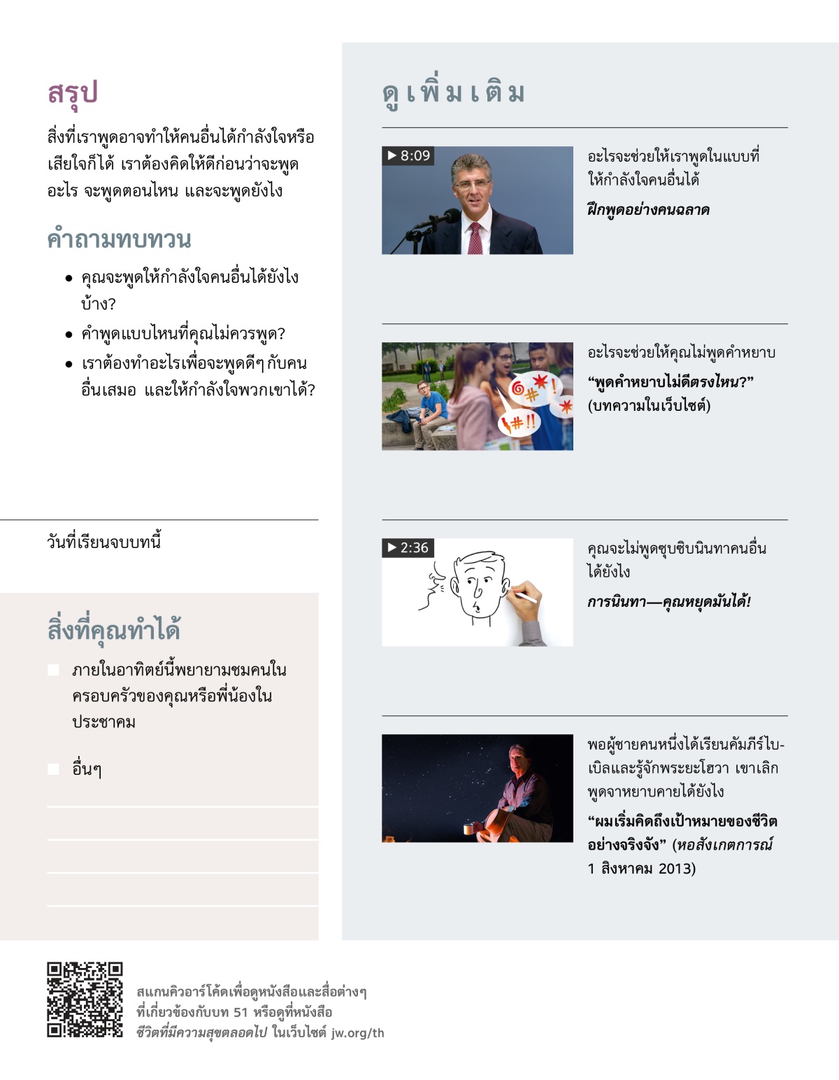 เราจะพูดถึงคนอื่นในทางที่ดี หรือไม่วิพากษ์วิจารณ์พวกเขาได้ยังไง เปิดวีดีโอ แล้วคุยกันเกี่ยวกับคำถามต่อไปนี้