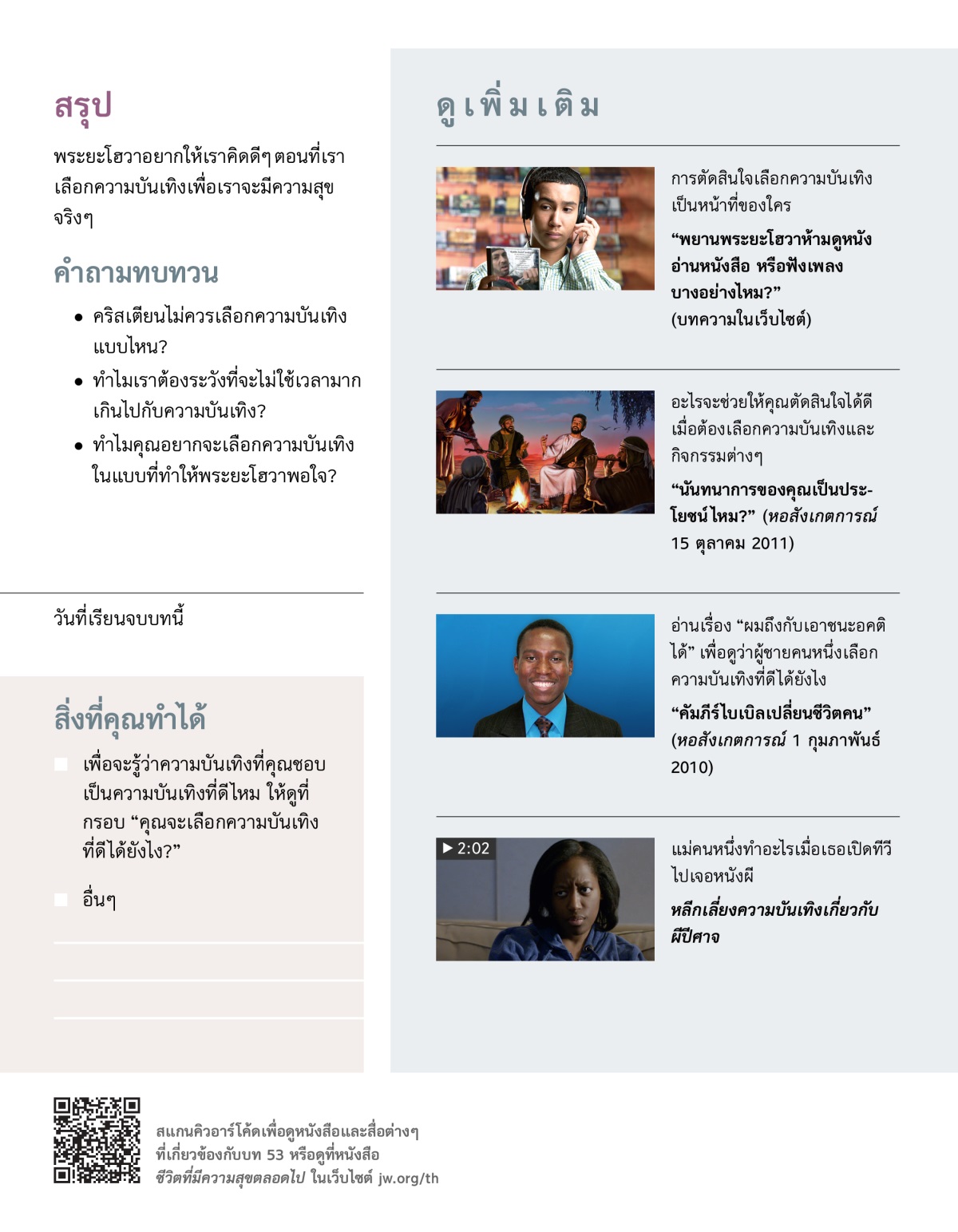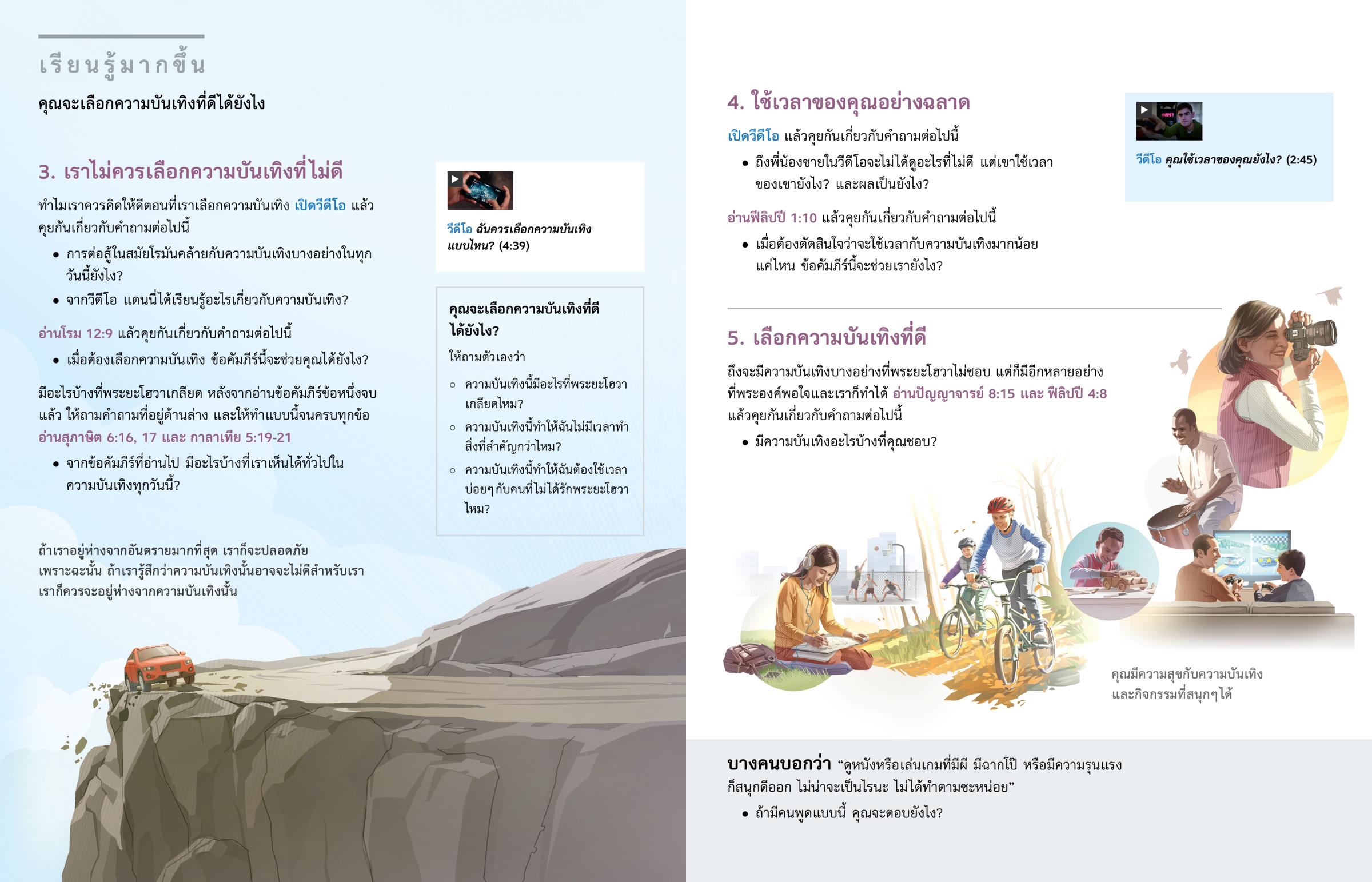 ตอนที่คุณพักผ่อน คุณชอบทำอะไรบ้าง? บางคนชอบอยู่บ้าน อ่านหนังสือ ดูหนังฟังเพลง หรือเล่นอินเทอร์เน็ต ส่วนบางคนก็ชอบไปกับเพื่อน ๆ เช่น ไปเที่ยว ไปว่ายน้ำ หรือเล่นเกมด้วยกัน ไม่ว่าเราจะชอบความบันเทิงแบบไหน เราต้องทำให้แน่ใจว่าเราได้เลือกความบันเทิงแบบที่ “ผู้เป็นนายพอใจ” (เอเฟซัส 5:10) เรื่องนี้สำคัญมากเพราะความบันเทิงหลายอย่างเกี่ยวข้องกับสิ่งที่พระยะโฮวาเกลียด เช่น ความรุนแรง การผิดศีลธรรม หรือเกี่ยวข้องกับไสยศาสตร์ (อ่านสดุดี 11:5) แล้วอะไรจะช่วยเราให้เลือกความบันเทิงที่ดีได้?