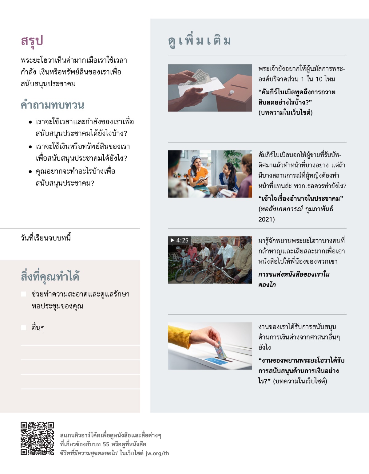มาดูว่าเงินบริจาคของเราเอาไปใช้ทำอะไรบ้าง เปิดวีดีโอ แล้วคุยกันเกี่ยวกับคำถามต่อไปนี้