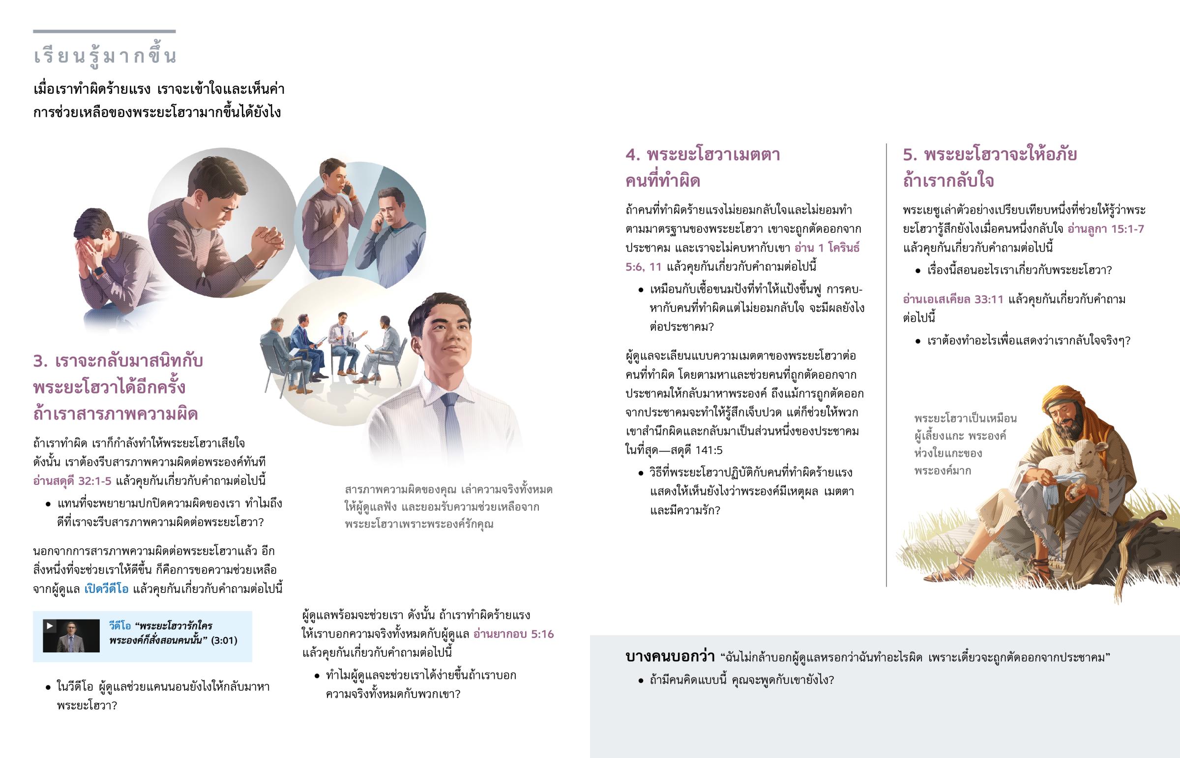 ถ้าเราทำผิดร้ายแรง ผู้ดูแลจะช่วยเรายังไง? จะมีการมอบหมายผู้ดูแลสองหรือสามคนให้ช่วยเรา พวกเขาจะให้คำแนะนำจากคัมภีร์ไบเบิลและกระตุ้นให้เราเปลี่ยนแปลงตัวเองเพื่อเราจะไม่กลับไปทำผิดซ้ำอีก ถ้าคนหนึ่งทำผิดร้ายแรงและไม่กลับใจ ผู้ดูแลจะต้องตัดเขาออกจากประชาคม เพื่อไม่ให้คนนั้นมีอิทธิพลไม่ดีต่อพี่น้องคนอื่น ๆ