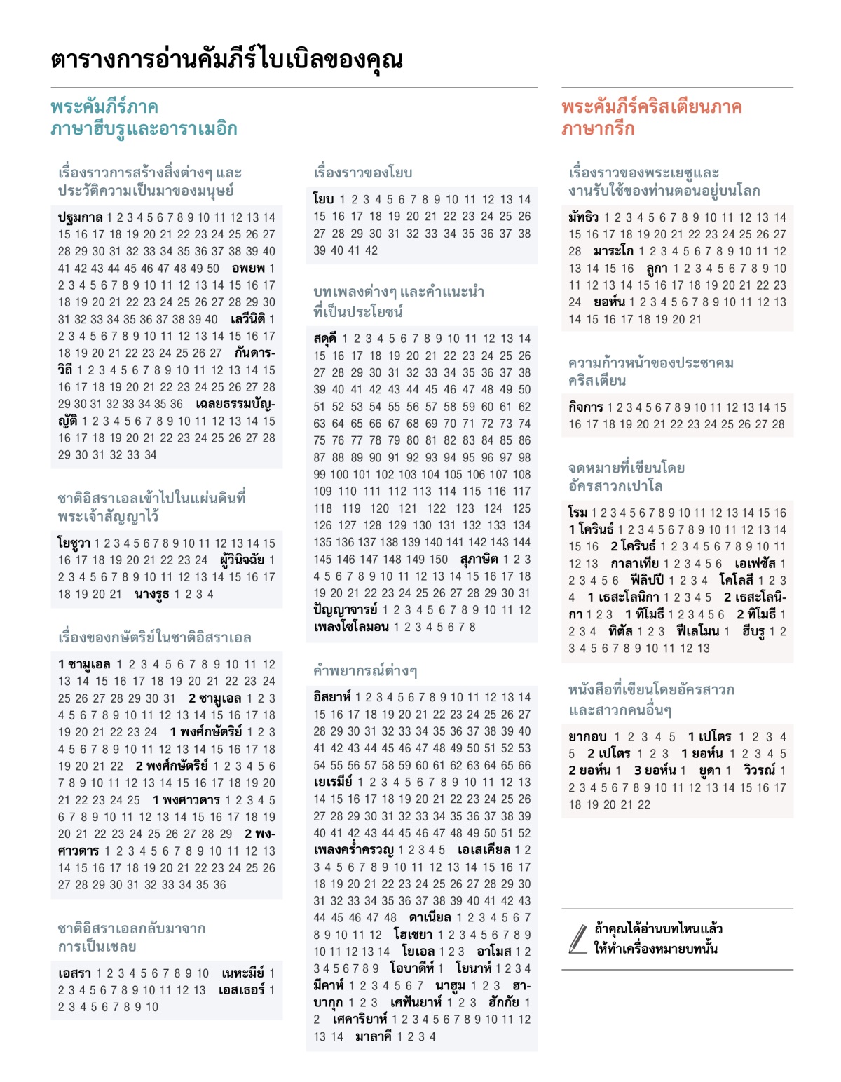 ตารางการอ่านคัมภีร์ไบเบิลของคุณ ถ้าคุณได้อ่านบทไหนแล้ว ให้ทำเครื่องหมายบทนั้น