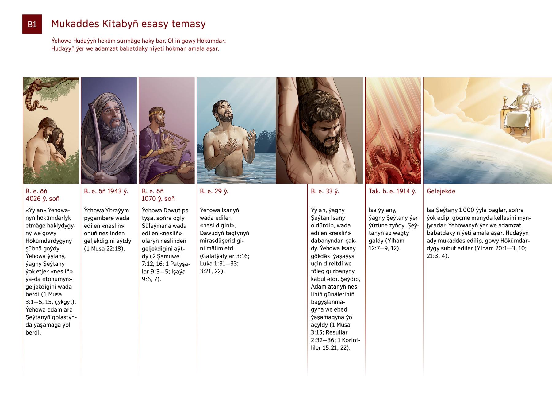 B. e. öň 4026 ý. soň «Ýylan» Ýehowanyň hökümdarlyk etmäge haklydygyny we gowy Hökümdardygyny şübhä goýdy. Ýehowa ýylany, ýagny Şeýtany ýok etjek «nesliň» ýa-da «tohumyň» geljekdigini wada berdi (1 Musa 3:1—5, 15, çykgyt). Ýehowa adamlara Şeýtanyň golastynda ýaşamaga ýol berdi. |