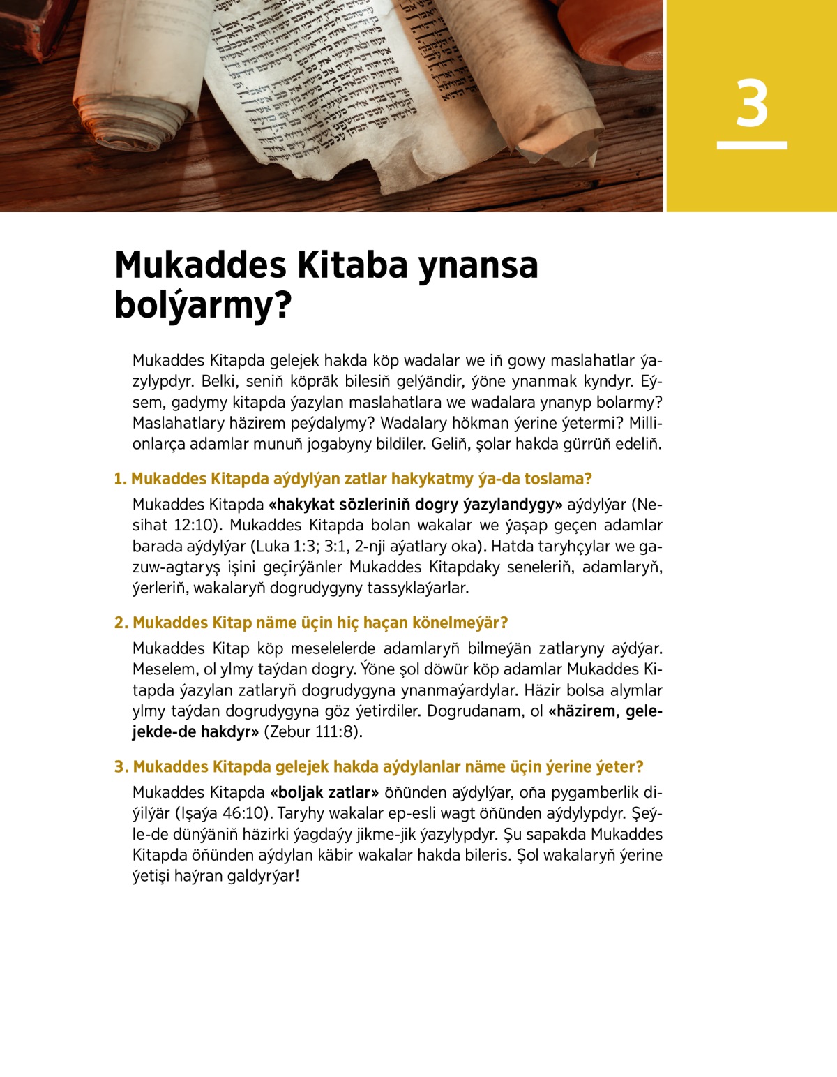 Mukaddes Kitapda gelejek hakda köp wadalar we iň gowy maslahatlar ýazylypdyr. Belki, seniň köpräk bilesiň gelýändir, ýöne ynanmak kyndyr. Eýsem, gadymy kitapda ýazylan maslahatlara we wadalara ynanyp bolarmy? Maslahatlary häzirem peýdalymy? Wadalary hökman ýerine ýetermi? Millionlarça adamlar munuň jogabyny bildiler. Geliň, şolar hakda gürrüň edeliň.