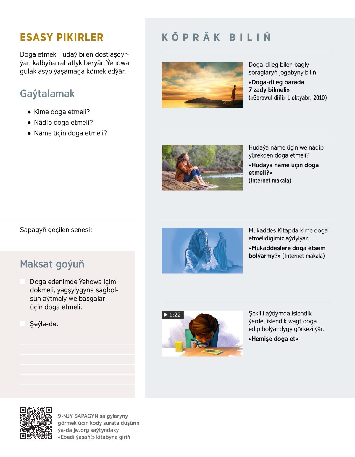 Käbir adamlar ýaly saňa-da durmuşda maslahat gerek bolýandyr. Ýa-da alada goýýan soraglaryň jogabyny bilesiň gelýändir. Käte bolsa kimdir biriniň göwünlik bermegini isleýänsiň. Belki-de, Ýehowa bilen has gowy dost bolasyň gelýändir. Şu zatlaryň barynyň bir çözgüdi bar. Hudaýa doga etmeli. Ýöne Hudaýa nädip doga etmeli? Ol ähli adamlaryň doga-dileglerini eşidýärmi? Ol seniň hem dogalaryňy eşidýärmikä? Geliň, bileliň.
