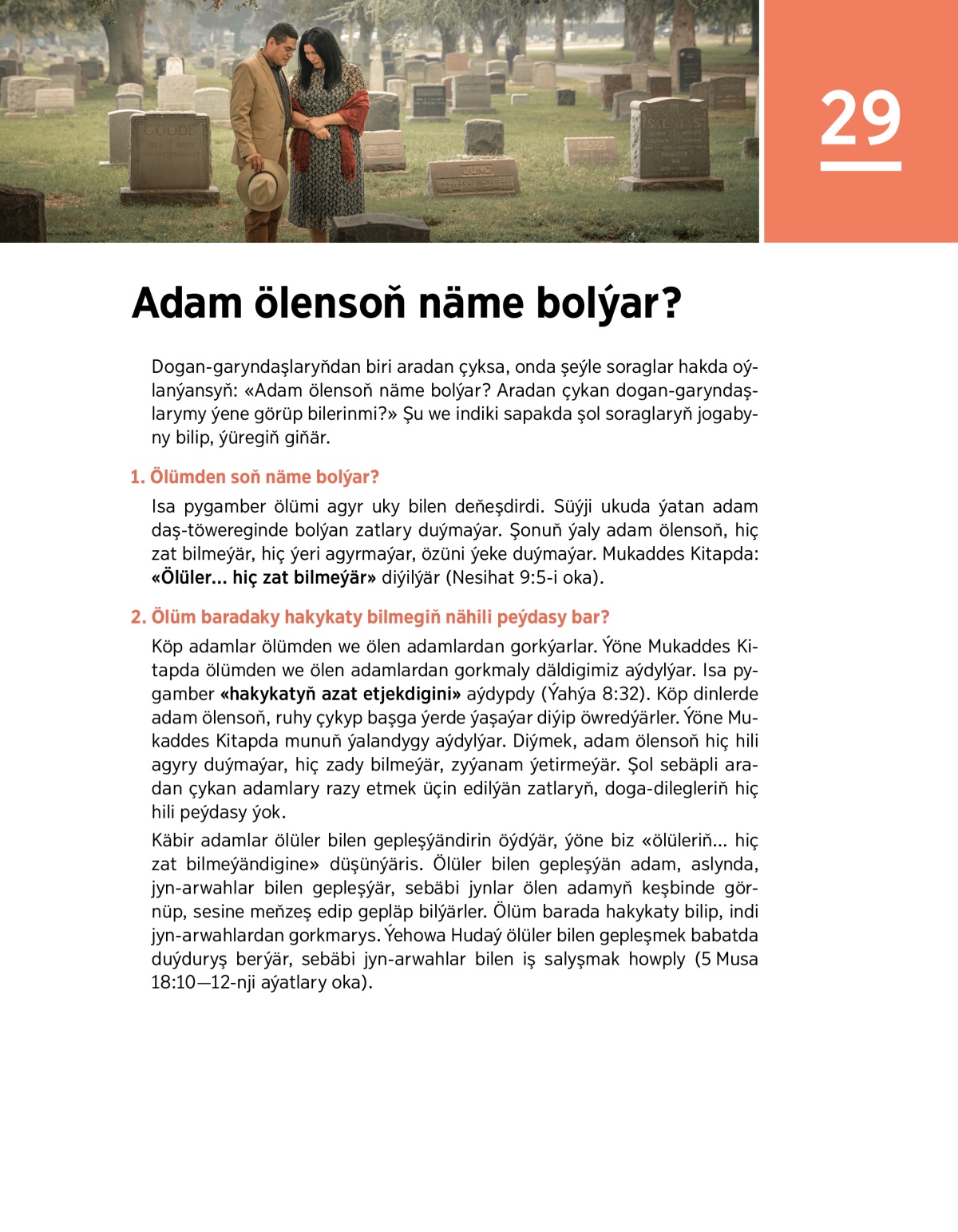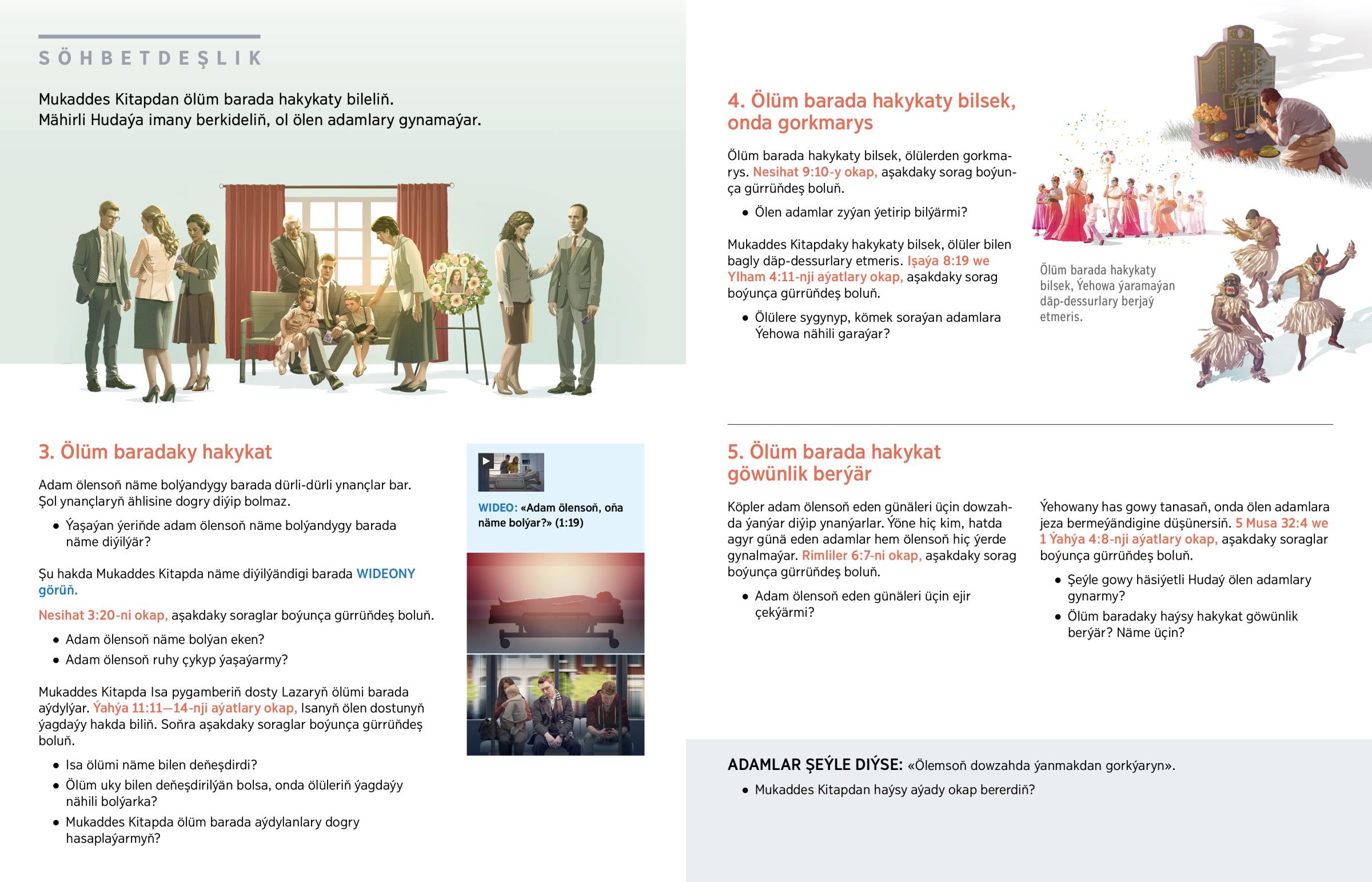 Dogan-garyndaşlaryňdan biri aradan çyksa, onda şeýle soraglar hakda oýlanýansyň: «Adam ölensoň näme bolýar? Aradan çykan dogan-garyndaşlarymy ýene görüp bilerinmi?» Şu we indiki sapakda şol soraglaryň jogabyny bilip, ýüregiň giňär.