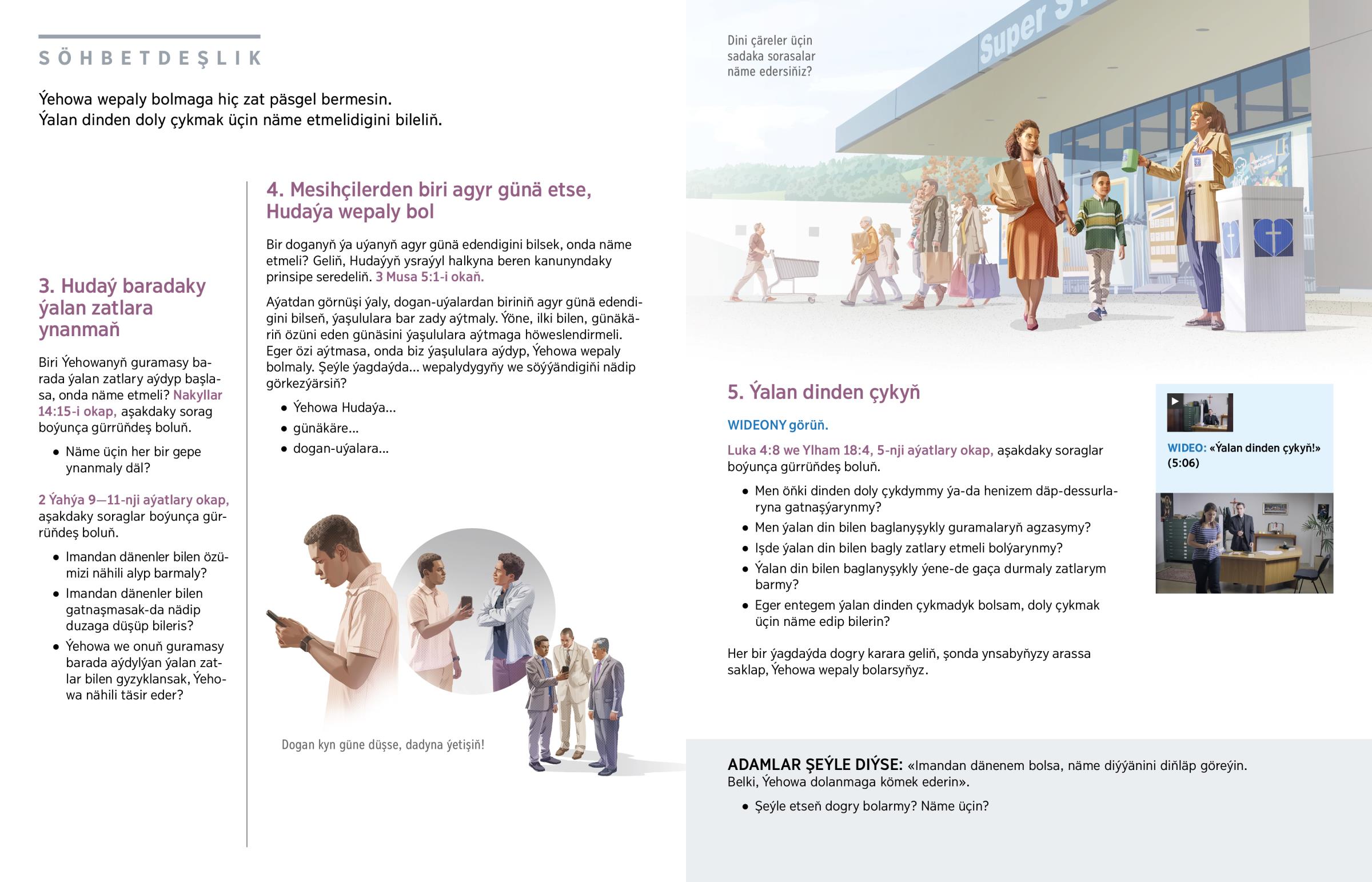 Ýehowany ýürekden söýsek, ýalan din bilen bagly ähli zatdan gaça durarys. Şeýle-de biz ýalan din bilen bagly işlerde işlemeris, däp-dessurlaryna, çärelerine gatnaşmarys. Ýehowa bize: «Eý halkym... (Beýik Wawilondan, ýagny ýalan dinden) çykyň!» diýýär (Ylham 18:2, 4).