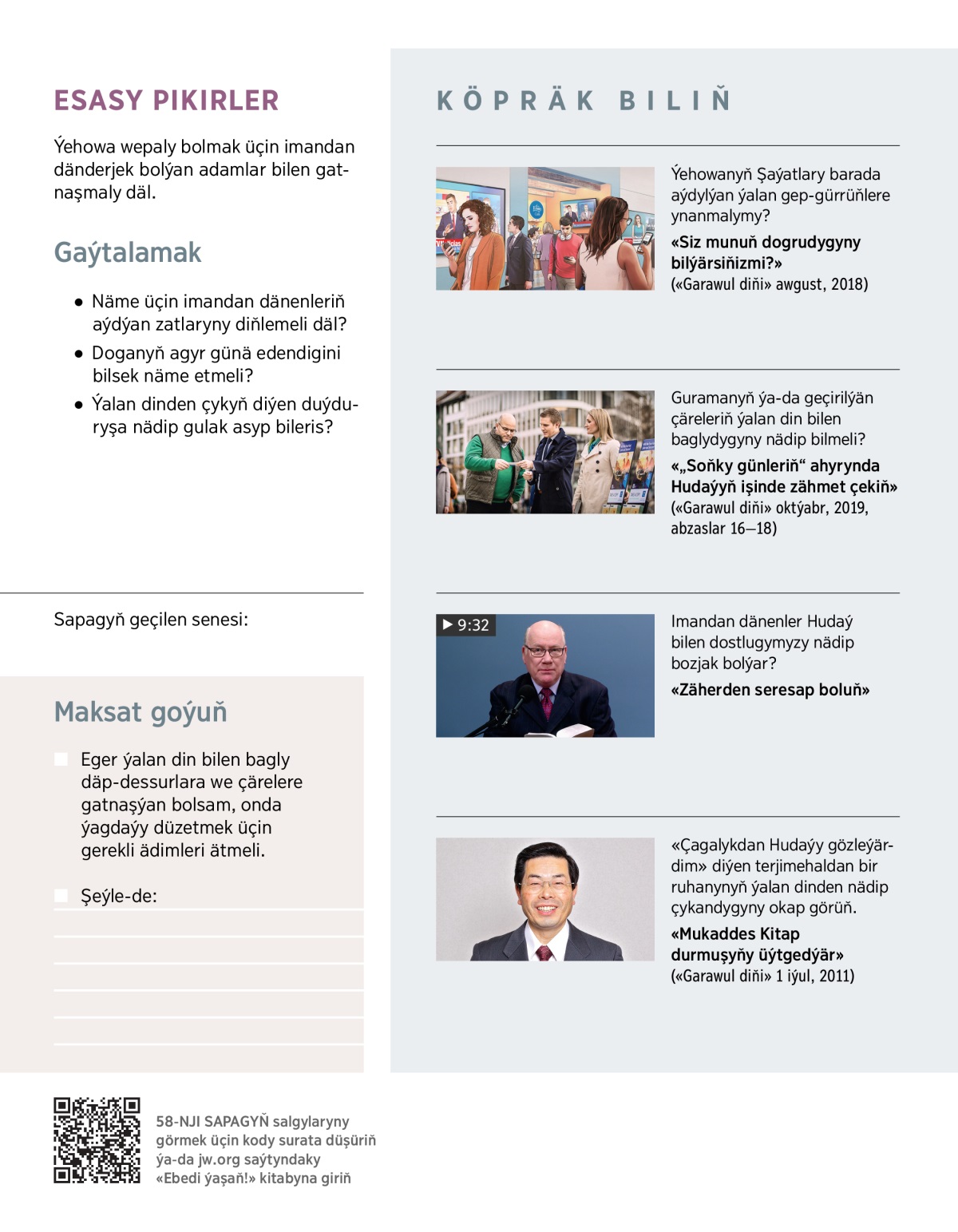 Käbir adamlar seniň Ýehowa gulluk etmegiňi islemeýär. Meselem, imandan dänenler. Olar bir wagt Ýehowa gulluk edip, soňra ondan ýüz öwren adamlar. Indi olar seni hem Ýehowadan ýüz öwürtjek bolup, Hudaýyň guramasy barada ýalan zatlary ýaýradýarlar. Ýalan zatlary diňe olar däl, dini ýolbaşçylaram ýaýradýar. Olar sada, ynanjaň adamlary aldap, Ýehowadan daşlaşdyrjak bolýar. Sen olaryň aýdýan zatlarynyň ýalandygyny subut etjek bolup, Internetde ýazan zatlaryny we kitaplaryny okasaň, saýtlaryna girseň, wideolaryny görseň, onda duzaga düşersiň. Isa pygamber imandan dänenler barada şeýle diýdi: «Olara üns bermäň, olar kör ýolbaşçylardyr. Eger kör köri idip ýol görkezse, ikisi-de çukura gaçar» (Matta 15:14).
